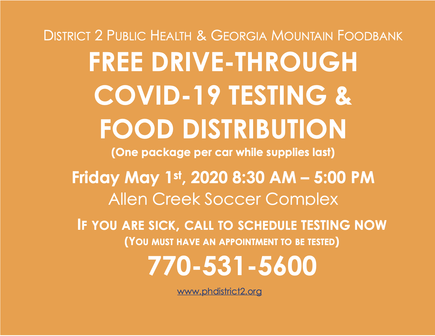 District 2 Public Health and the Georgia Mountain Food Bank are teaming up for a free COVID-19 testing and food distribution event this Friday, May 1.