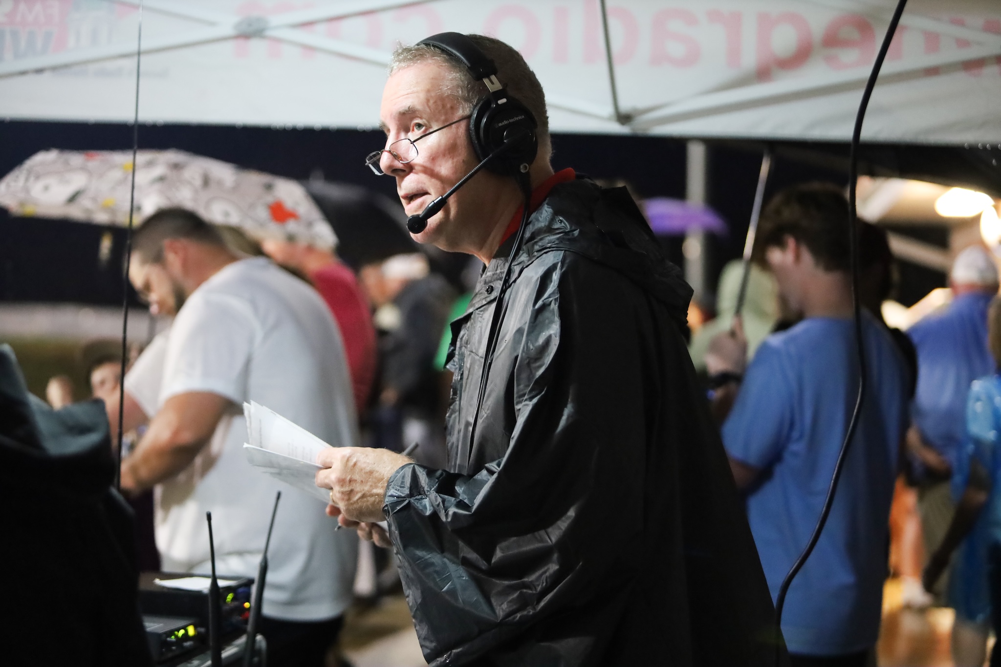 Ken Brady on the air during a rain-drenched Indians opener against Habersham Central on Aug. 15, 2025. (Riley Moody/NowHabersham.com)