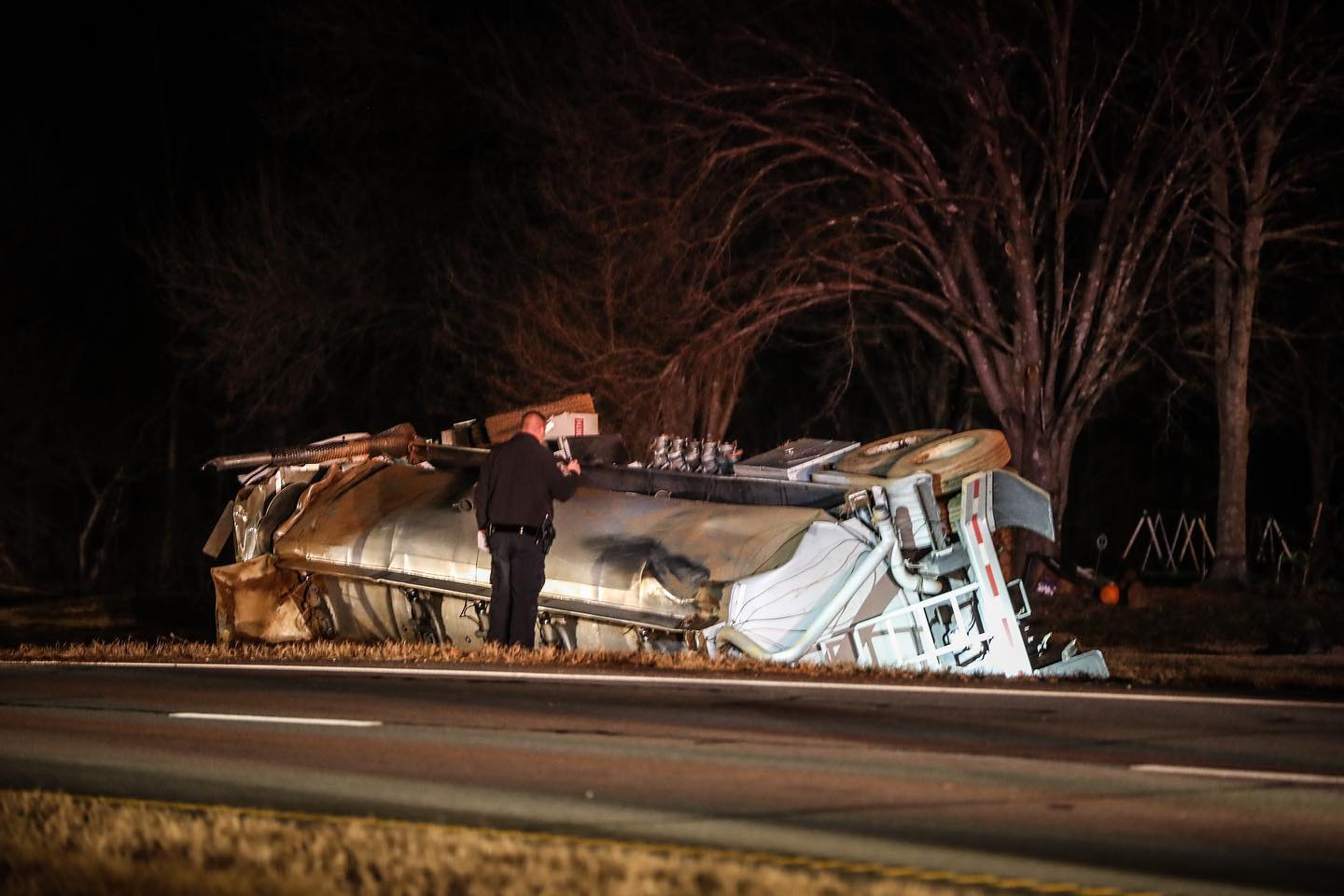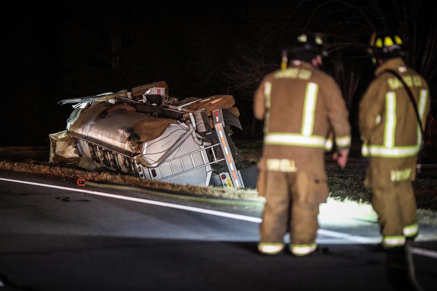 After crashing, the fuel leaked out of the tanker, causing officials to shut down a section of the highway between Free Drive and Shady Grove Road.