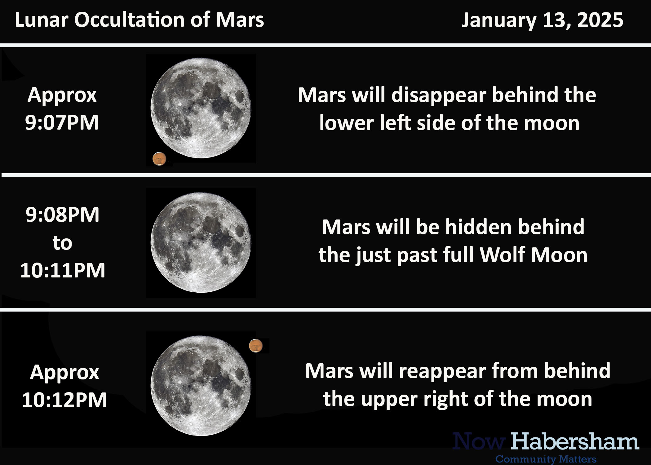 The first full moon of 2025 is here and includes a lunar occultation of Mars! (An occultation is when one object blocks the view of another object.)