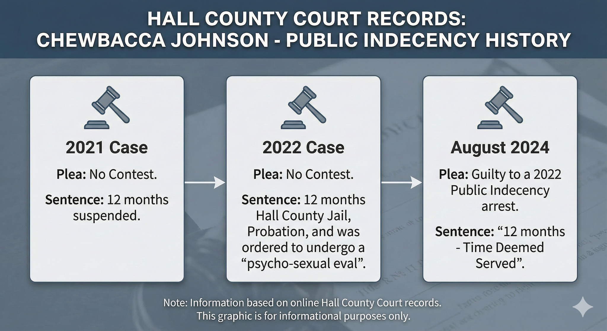 Johnson also pleaded no contest to public indecency charges in 2021 and 2022. In the 2021 case, he received a 12-month suspended sentence. In the 2022 case, records indicate he was sentenced to 12 months in the Hall County Jail, placed on probation, and ordered to undergo a psycho-sexual evaluation.