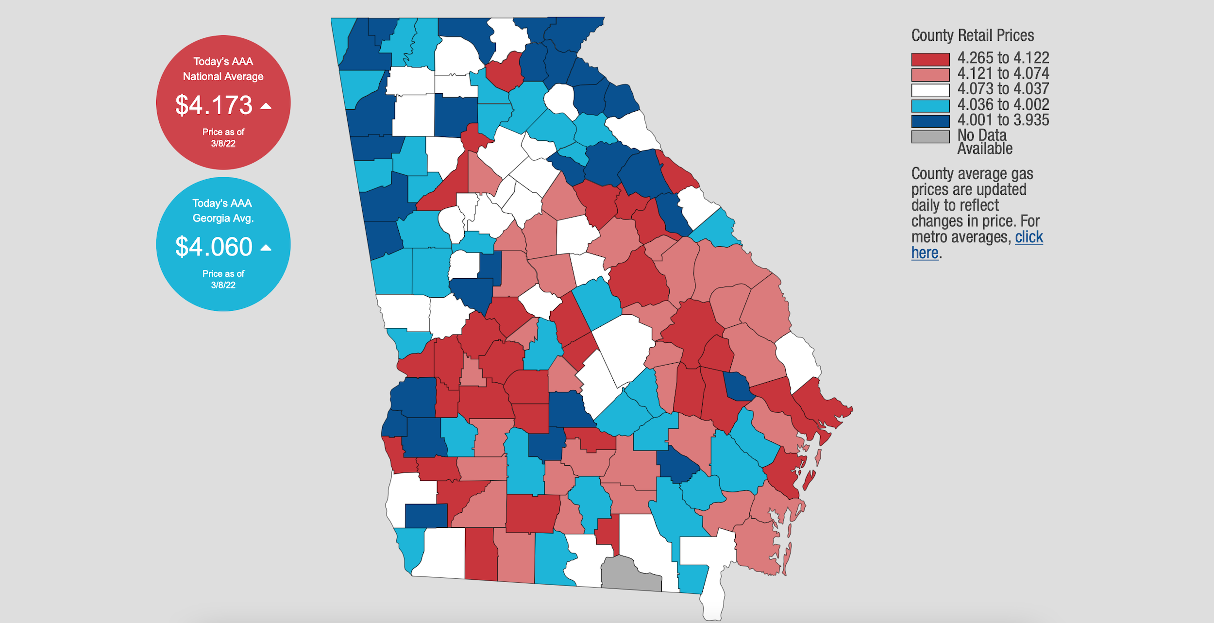 Gas prices in Northeast Georgia rose above $4 per gallon this week as the economic fallout from the war in Ukraine ramps up here at home. The situation in Europe has accelerated price increases at the pump, which were already rising as demand rebounded from a slump early in the pandemic, exceeding supplies.