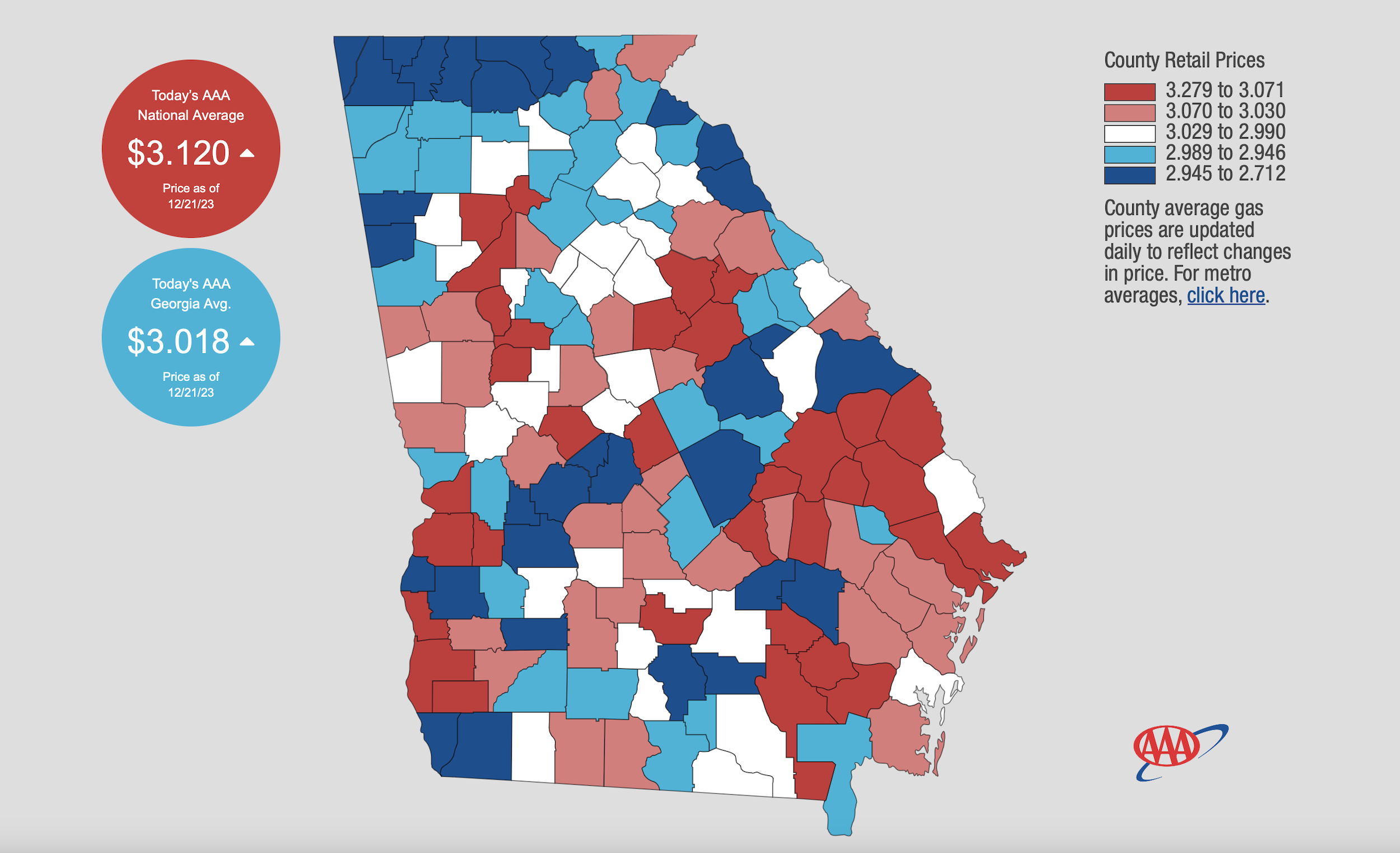 Georgia is basically there – a gallon of regular will cost the average Georgia motorist $3.003, according to AAA, better than the national average of about $3.09.