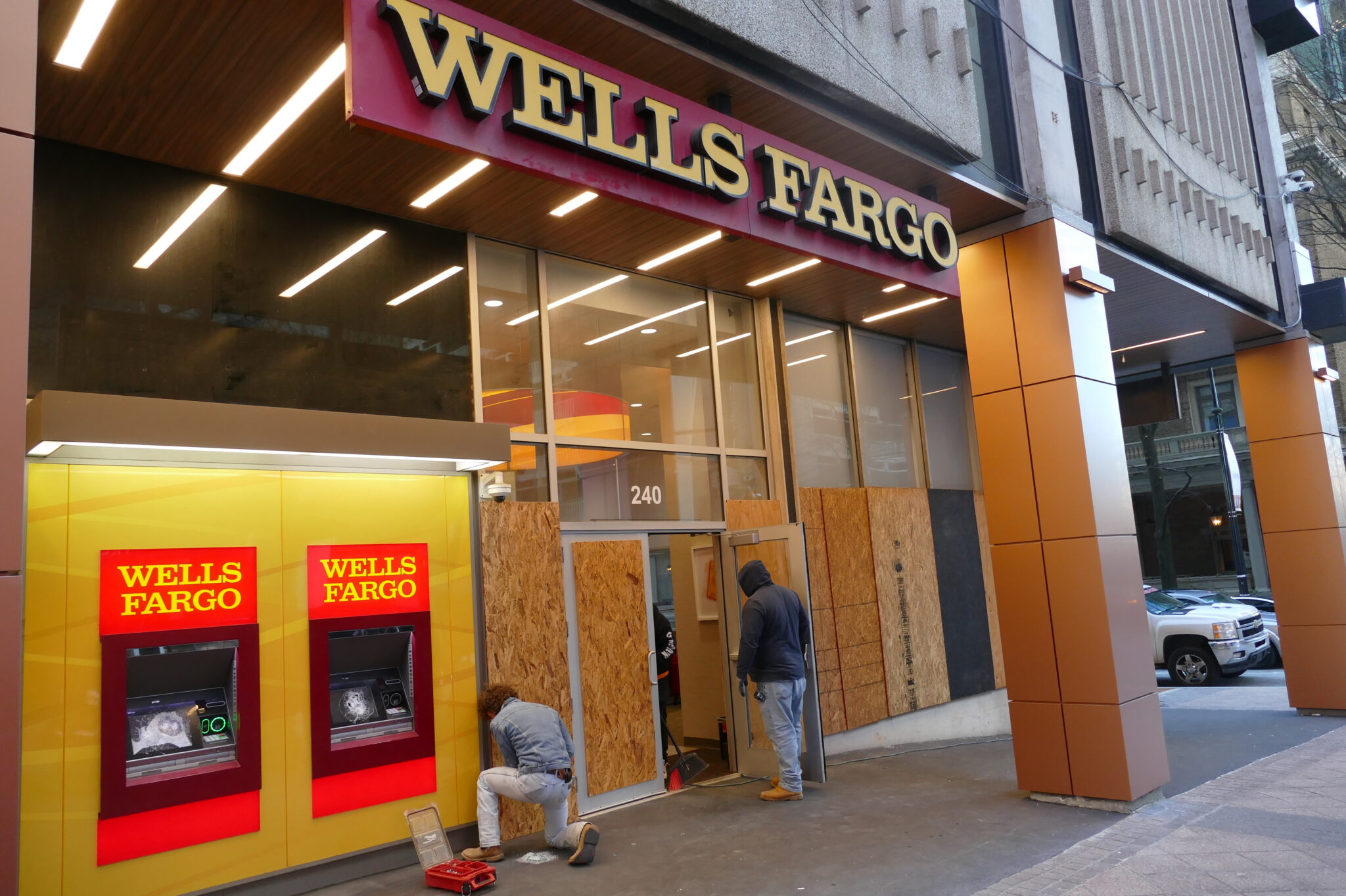 Workers boarded up shattered windows and doors at the Wells Fargo branch on Peachtree Street in downtown Atlanta Monday afternoon. The bank was apparently targeted by rioters for its support of the Atlanta Police Foundation, which backs a planned training center for law enforcement. (John McCosh/Georgia Recorder)