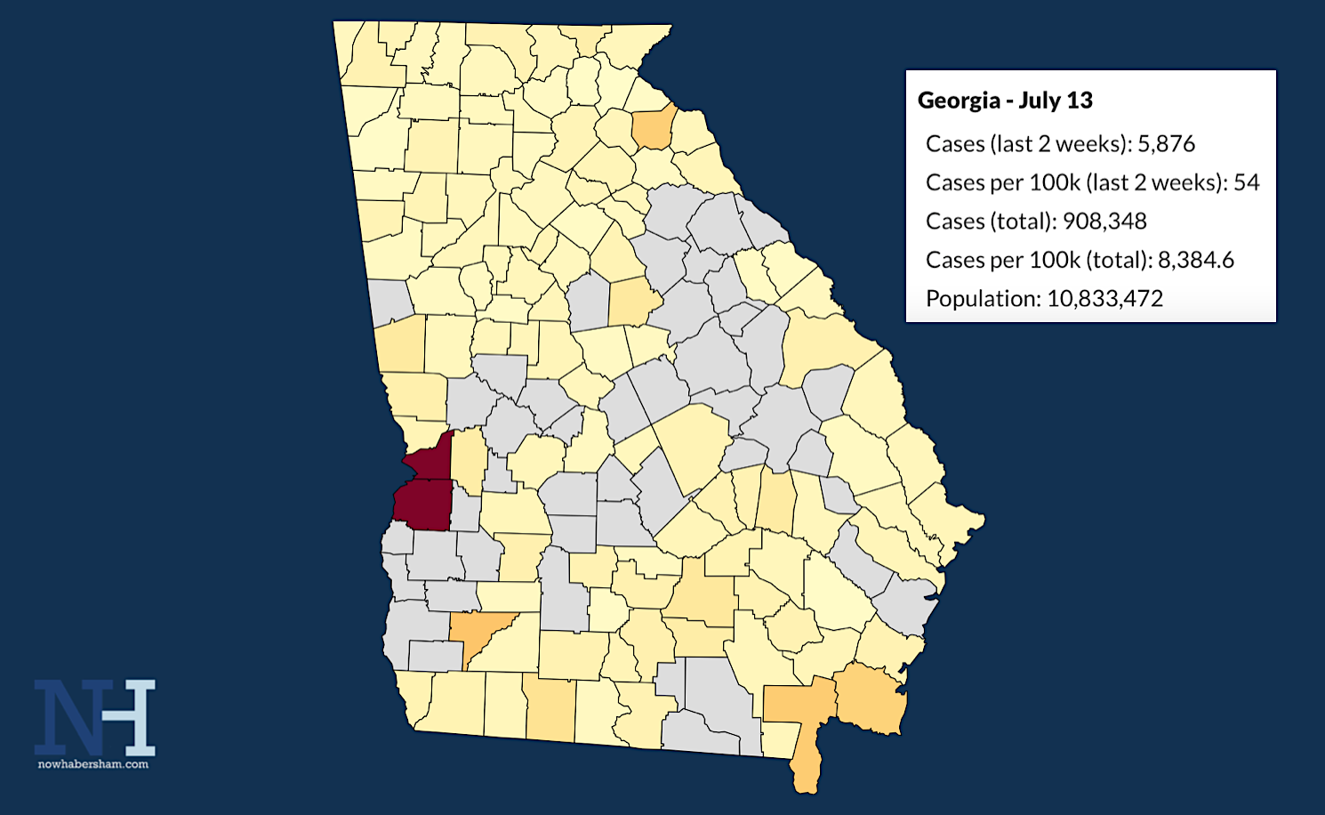 Northeast Georgia's Franklin County has reported 59 new COVID cases and five COVID-related deaths since July 1. In Habersham, three people died with the virus in June. At least 18,592 people in Georgia have died with COVID-19 since the outbreak began in March 2020. (Source: GA Dept. Public Health)