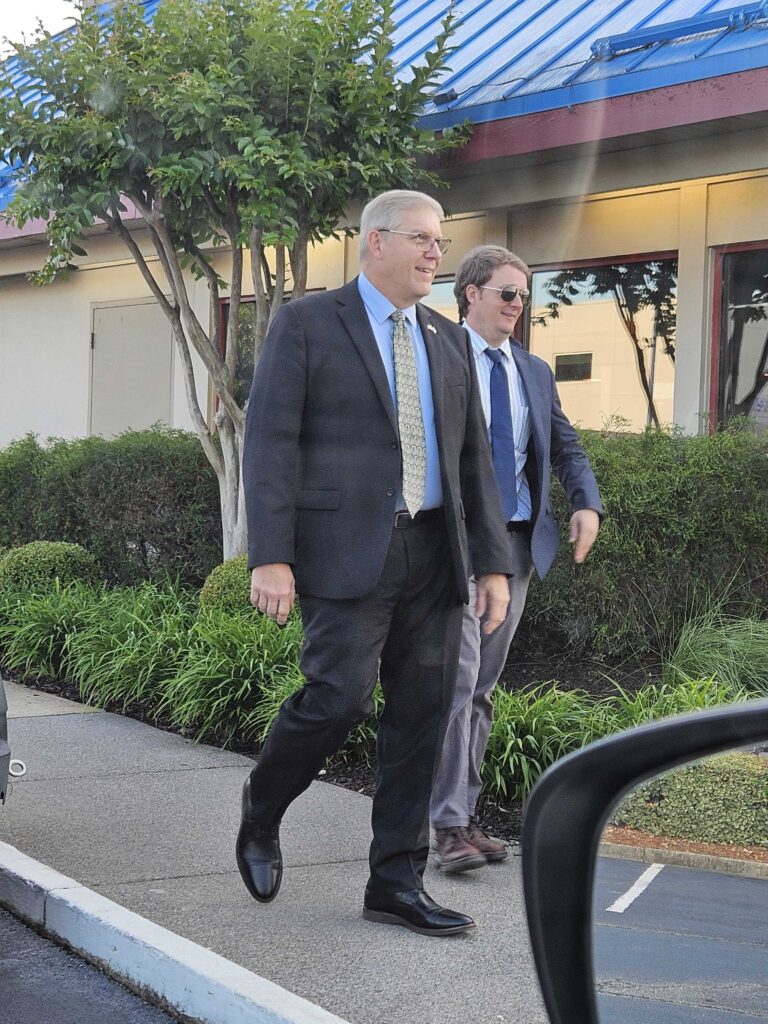 “We don’t right now,” he said in the IHOP parking lot. “I’m out in the community continuously doing things like this meeting. The town halls we’re doing have been pretty open. So we just haven’t had any of those old traditional town halls because they have not been productive. It’s usually just a chance for people to come in and take over and scream and holler and so we found it more productive to do more smaller venues such as what I’m doing here.”