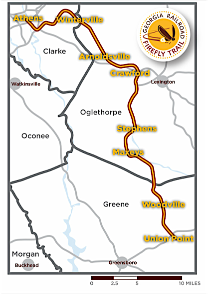 When complete, the Firefly Trail will pass through the towns of Woodville, Maxeys, Stephens, Crawford, Arnoldsville, and Winterville, terminating in Union Point.