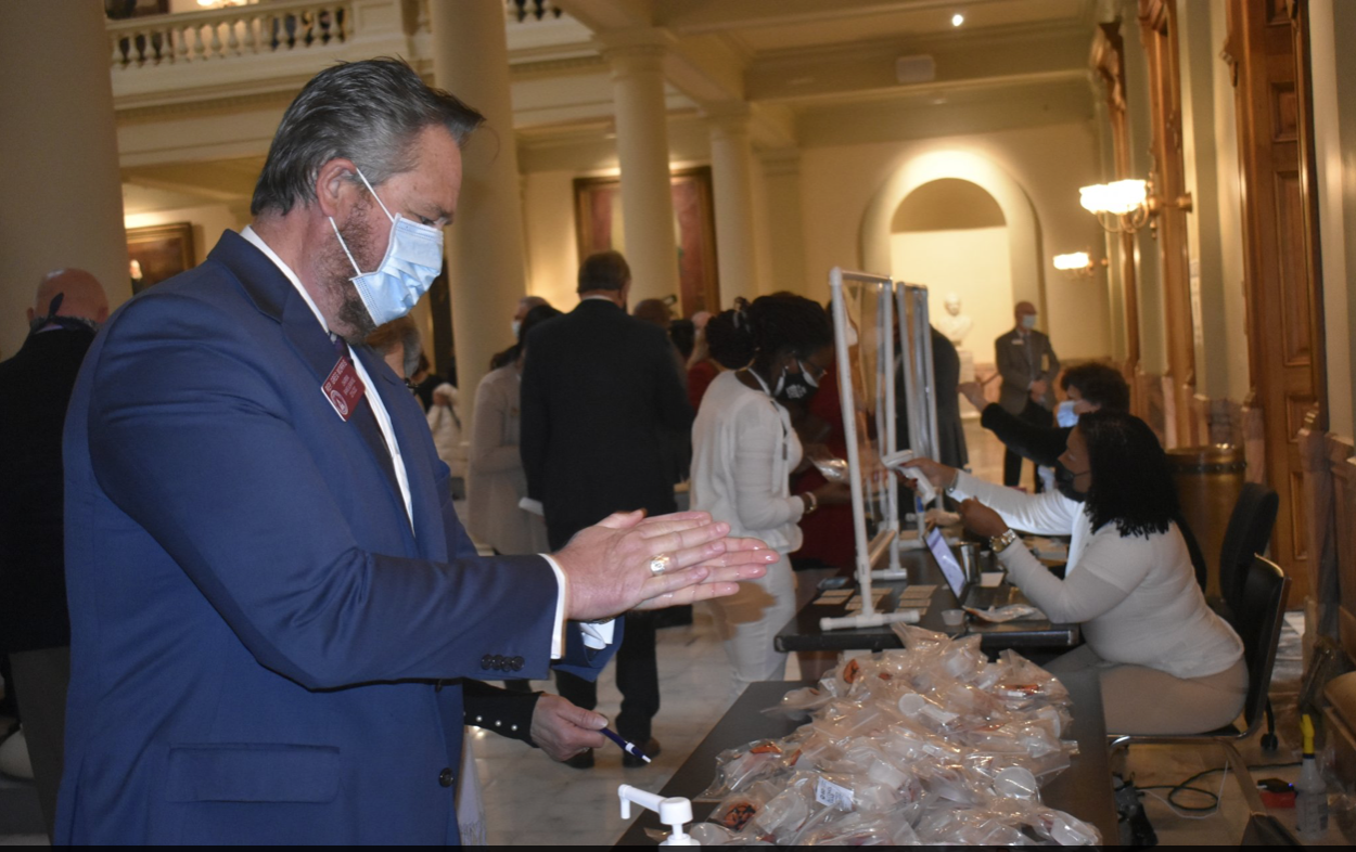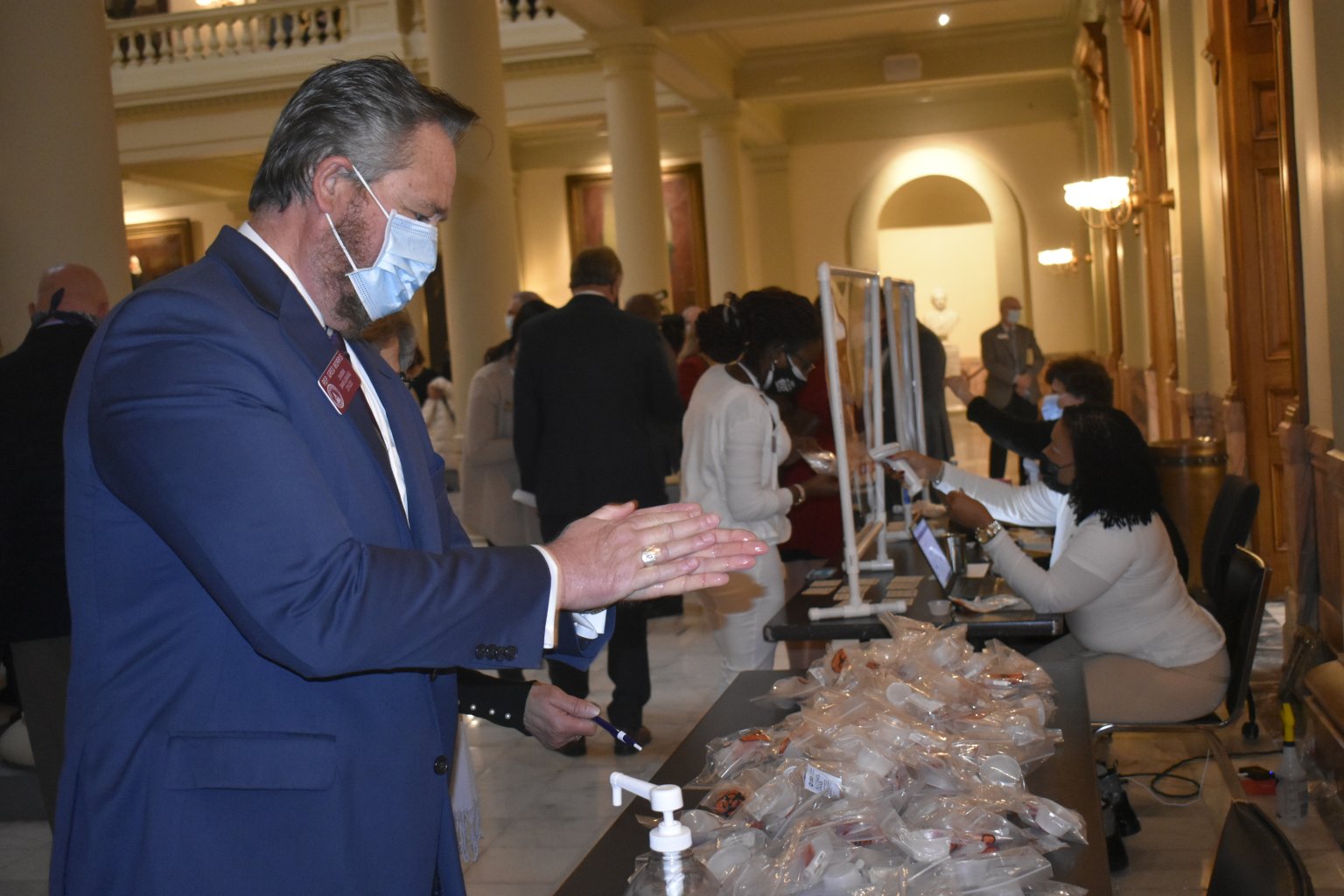 Rep. Greg Morris, a Republican from Vidalia, sanitizes his hands as lawmakers prepare for their first day of mandatory testing during the 2021 legislative session. (Ross Williams/Georgia Recorder)