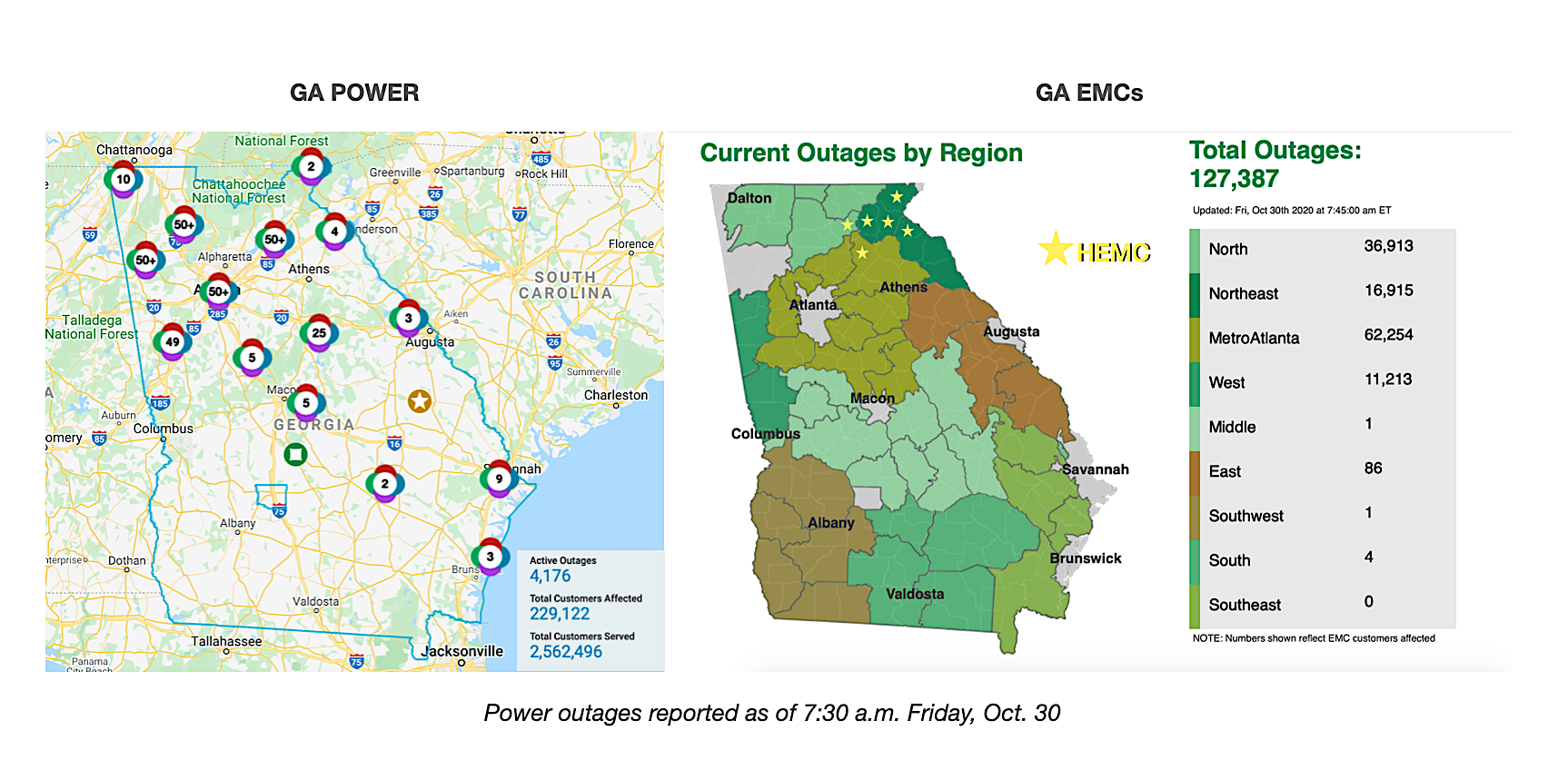 Nearly a quarter-million Georgia Power customers and approximately 127,000 EMC customers are still without electricity more than 24 hours after Hurricane Zeta roared through the state. The storm killed three people in North Georgia and caused widespread damage and power outages. Most of the outages are from metro-Atlanta north, including more than 40,000 in Northeast Georgia.