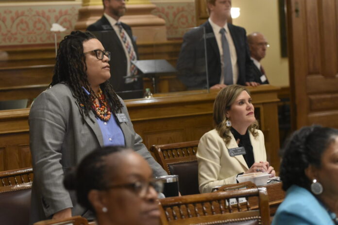 Democratic Sens. Kim Jackson, left, and Elena Parent watch votes come in for the Senate’s gender-affirming care ban for inmates. Jackson opposed the bill and Parent voted for it (Ross Williams/Georgia Recorder)
