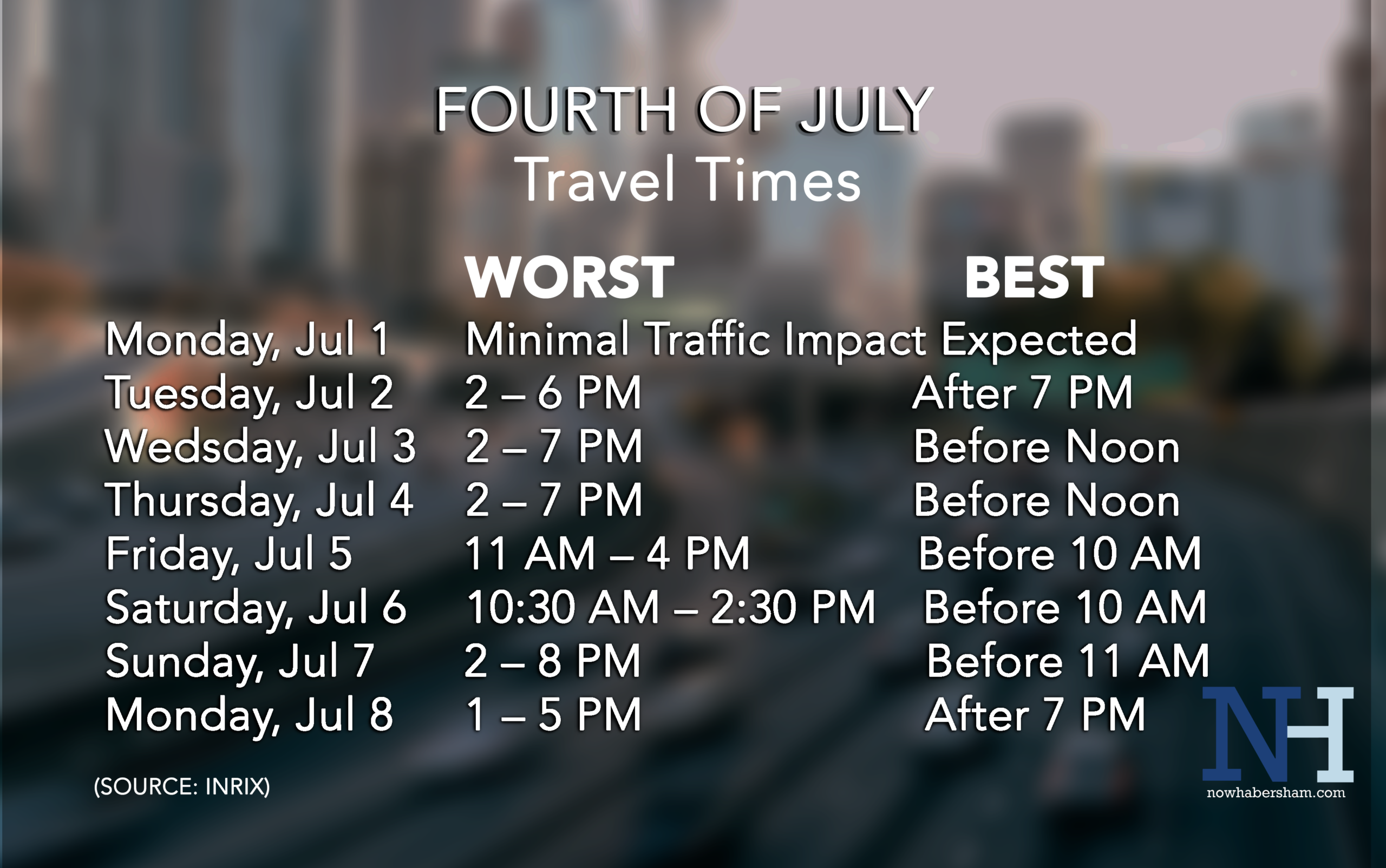Transportation data analytics company INRIX says the best time to travel is Wednesday, July 3, between 2-7 p.m. and before noon on Thursday, July 4. The worst time to travel is Sunday, July 7, between 2-8 p.m. and before 11 a.m.