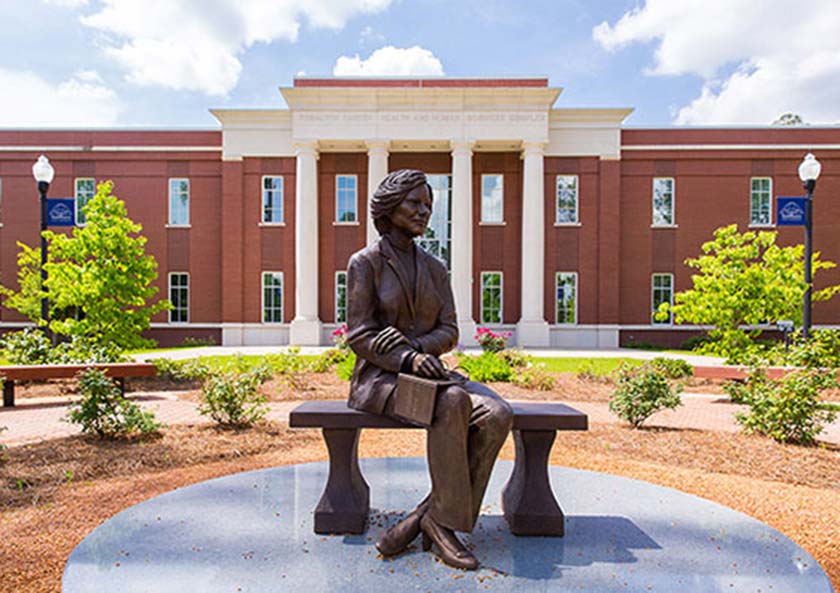 A statue of former First Lady Rosalynn Carter sits outside two buildings dedicated in her honor at Georgia Southwestern State University, her alma mater and home of the Rosalynn Carter Institute for Caregivers. (Credit: Georgia Southwestern State University)