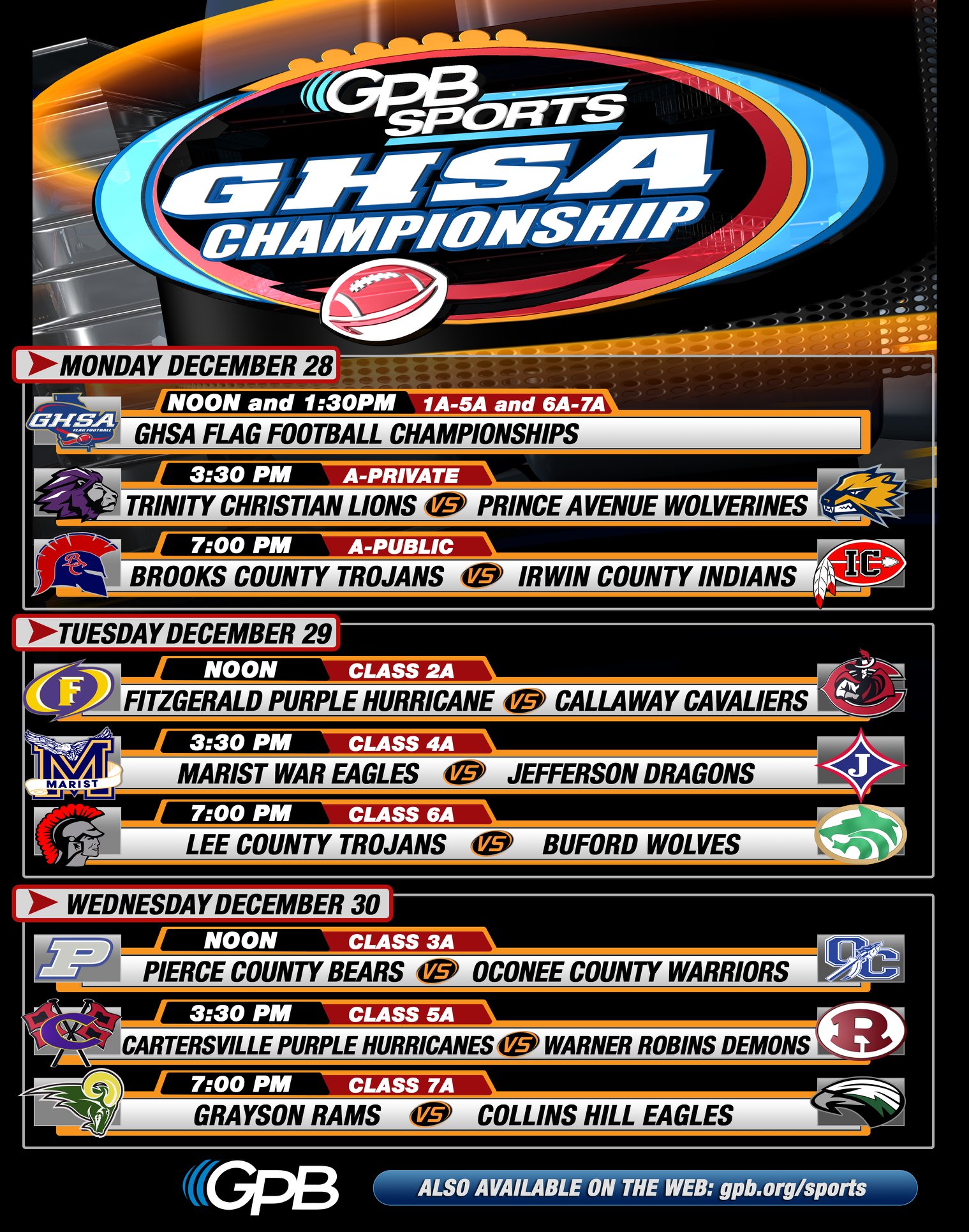 The 2020 GHSA-Tommy Guillebeau State Football Championships will be held December 28-30 at Georgia State University’s Center Parc Stadium. All games, including the first-ever girls’ Flag Football championships, will be televised live on Georgia Public Broadcasting and streamed at GPB.org/sports and NFHSNetwork.com.