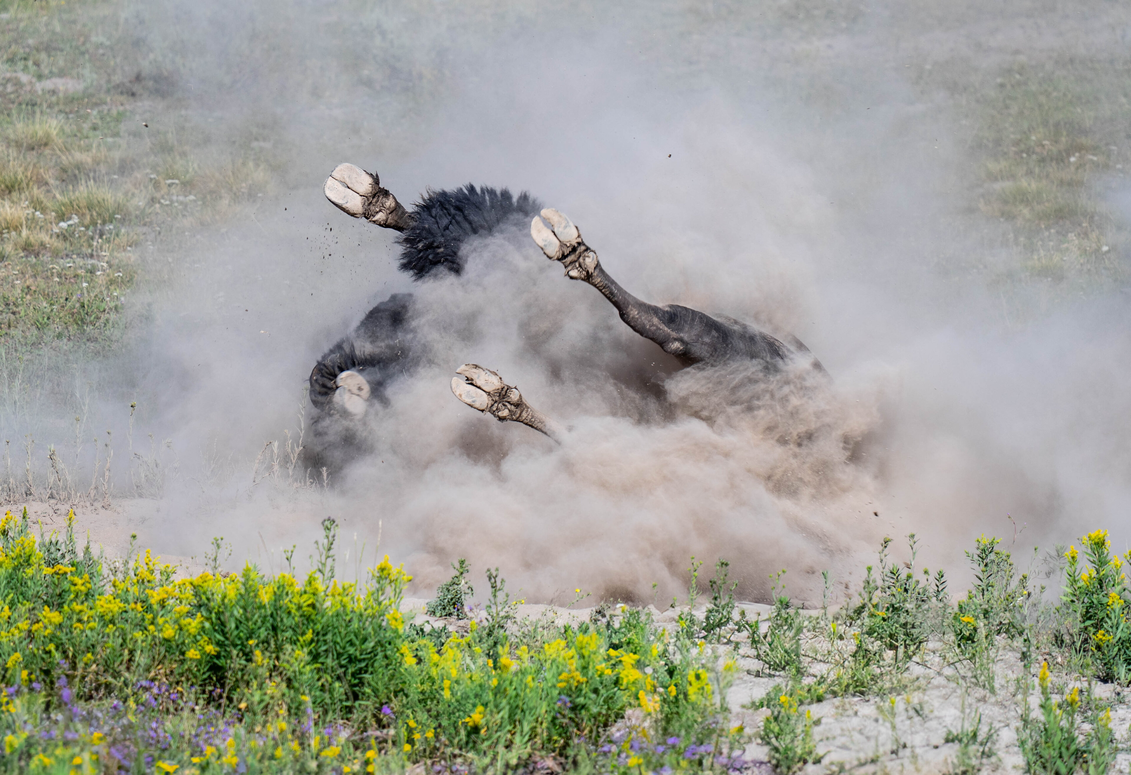 Bison are by far the most prolific large mammal in the park, and we saw countless (likely several hundred) of them on our trip. On our drive through the Hayden River Valley, we came across several, including this fellow that we watched for a while. After spending some time creekside, he wandered in our direction and found a good place for a dust bath. Bison do this for the same reason as many other animals: to help discourage insects and mites.