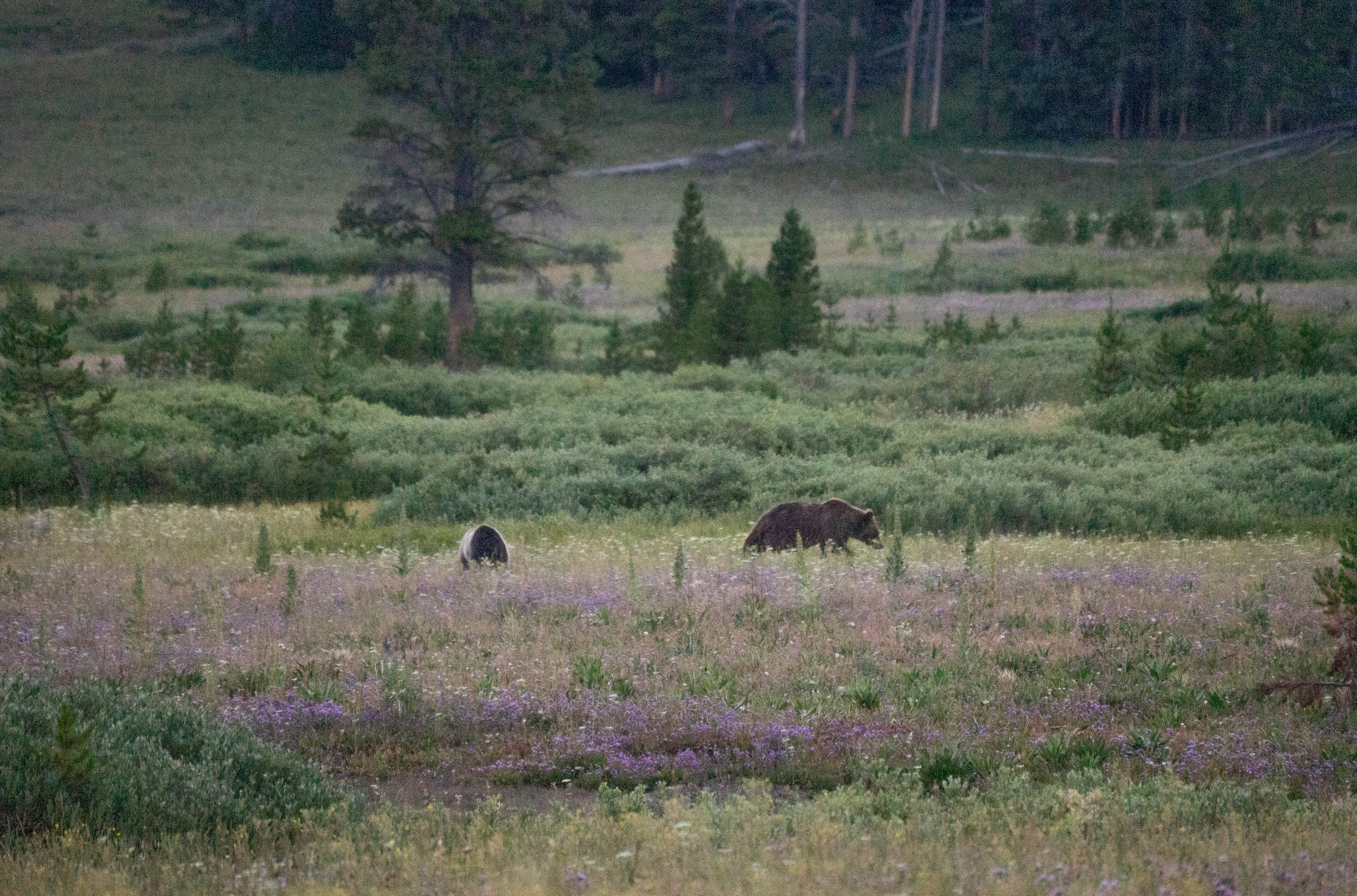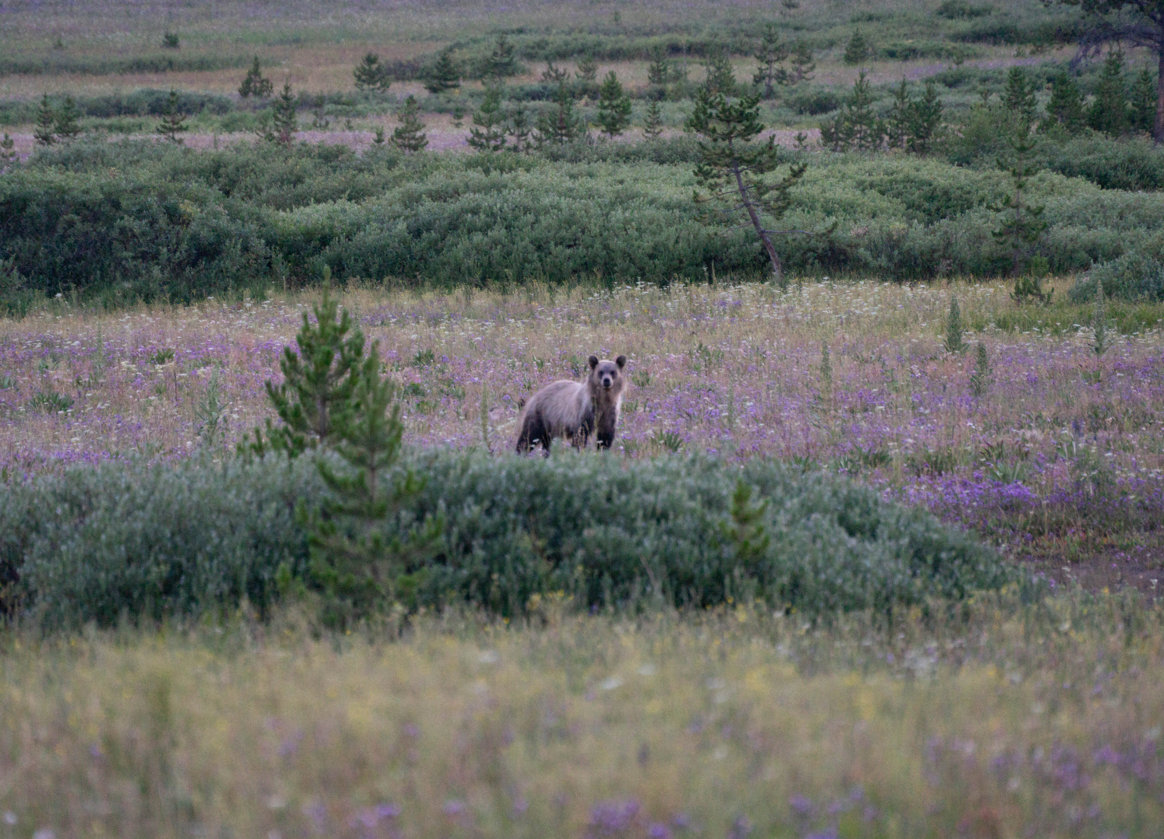 The hike into Cascade Lake was absolutely beautiful. The sun was setting as we hiked in, and dusk was falling over the beautiful rolling fields full of wildflowers. After fighting off thousands of mosquitoes, we finally got near our campsite. About 1/4 mile away, I noticed something moving in the trees. We both froze, my buddy got out his binoculars, and I peeled my eyes. I was almost certain I knew what I had seen, but I wanted to be sure. After a tense moment, not one, not two, not three, but FOUR grizzly bears emerged from the woods about 100-150 yards ahead of us and to our left. Where was my telephoto lens again? In the truck. The bears moved slowly as they meandered among and munched on the huckleberry bushes.