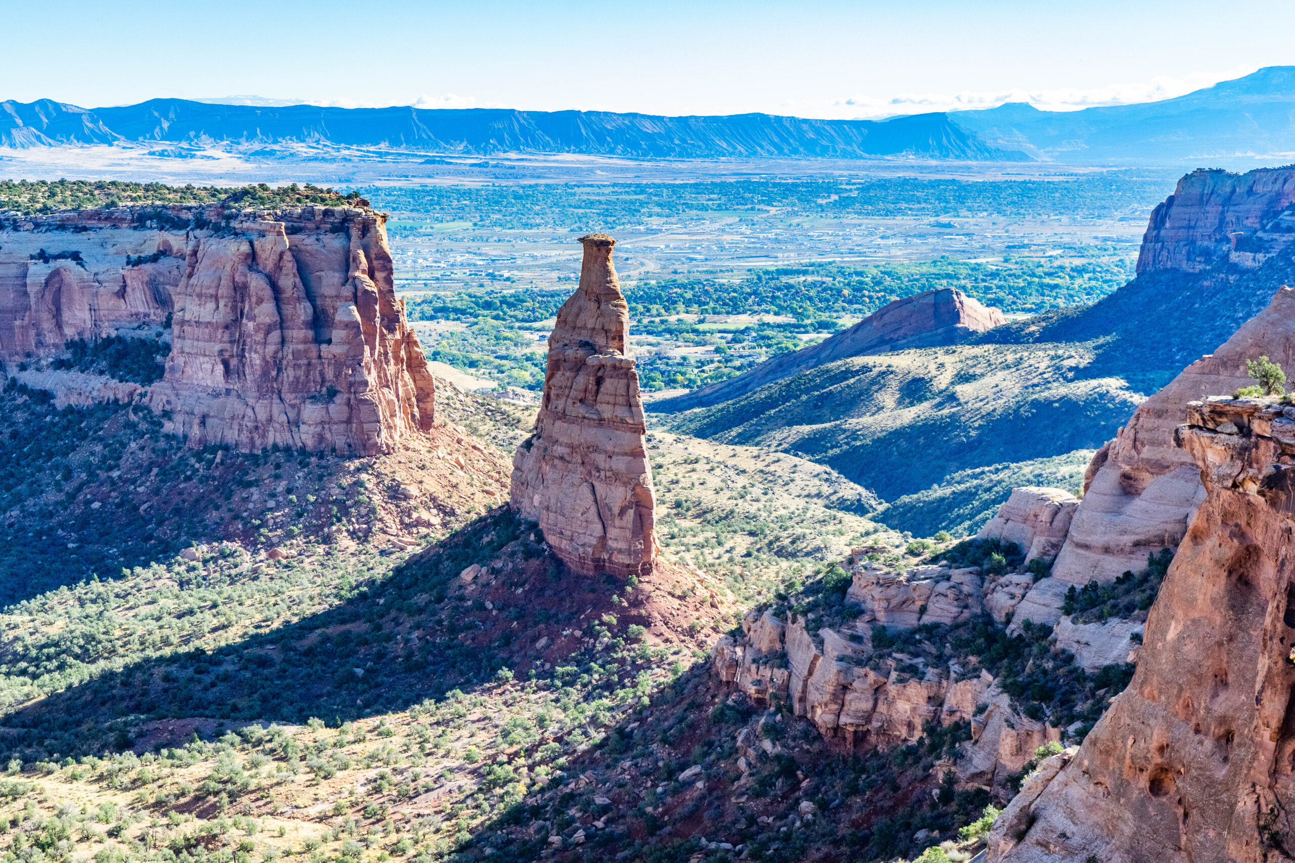The red stone cliffs and spires of this area are absolutely incredible. The main spire is Independence Rock, visible from many points in the monument. First climbed by Otto himself, a tradition continues to this day of summiting the rock on July 4 and raising an American flag. The bushes and trees beneath give some sense of the scale of this giant rock.