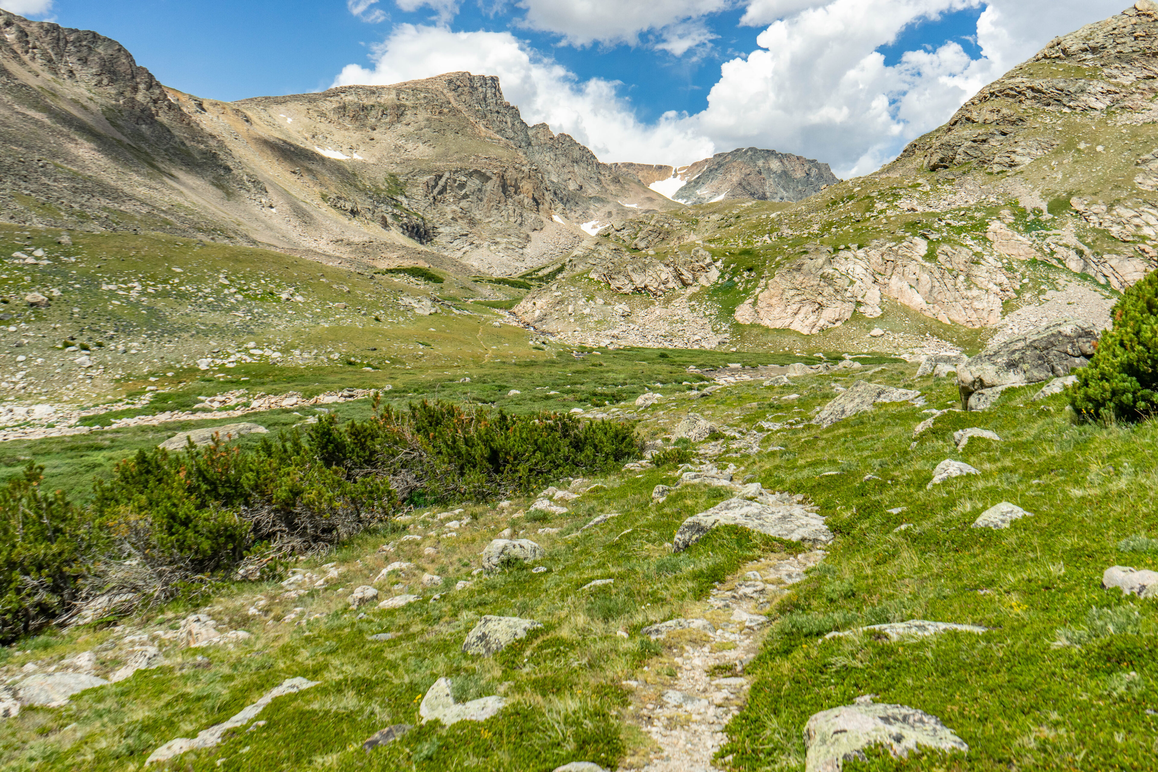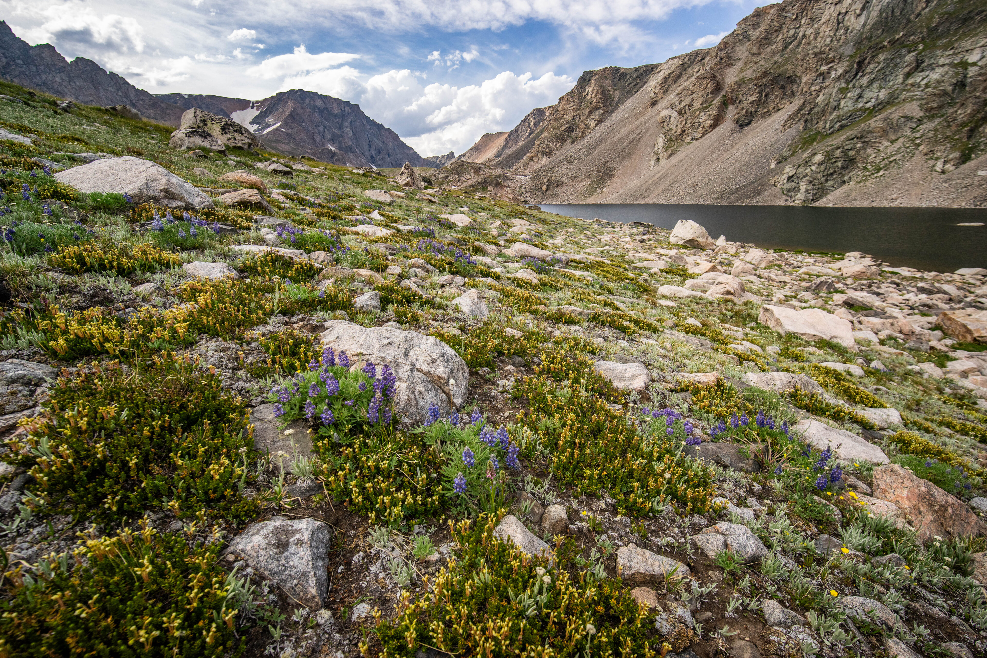 There’s really no way around it when you are in the Beartooth Mountains: it is going to be steep. In this case, very steep. An unmaintained social trail runs up from the Glacier Lake trail and it was certainly cut with no regard for the people going up it. Used mainly by people going up to fish the high elevation lakes, this trail runs through some of the most remote, rugged scenery you can imagine. However, this ruggedness also means absolute, unmatched beauty. We were rolling in just as the wildflower season was peaking. This area, that is currently covered in several feet of snow as of December, was a beautiful green mountainside in late July.