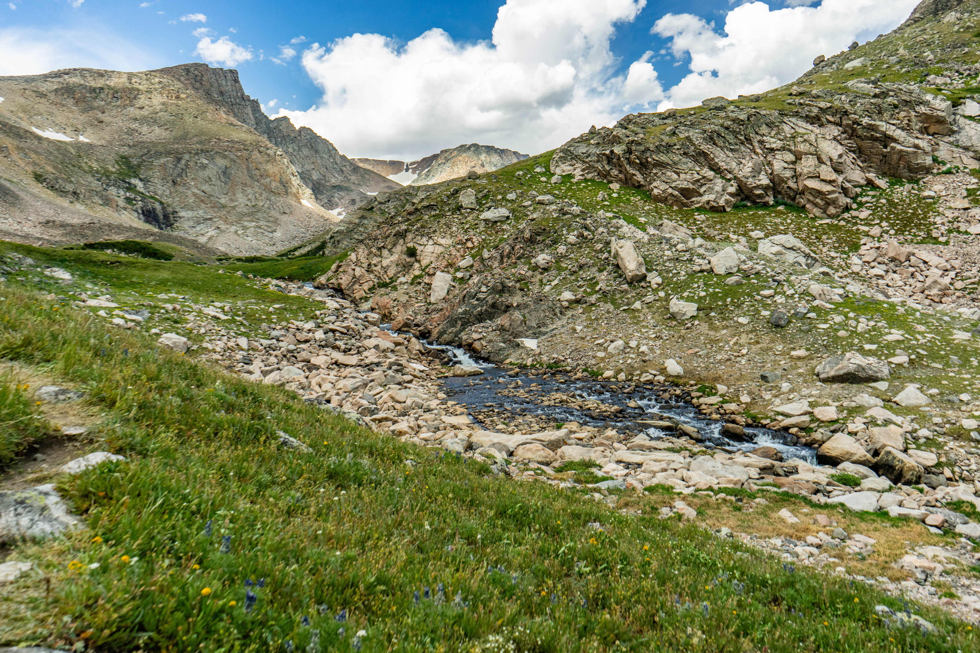As we climbed our way to the top I had to take many breaks. The weight of the pack combined with the quickly increasing elevation was absolutely wearing me out. We gained about 1500ft of elevation in right at 3 miles, mostly done in small spurts of 100-200ft at a time and more gradual rises in between. After a couple hours we found our way just beneath Shelf Lake. Here, the creek blows through the countless rocks and with the blue skies above it really looked out of this world.
