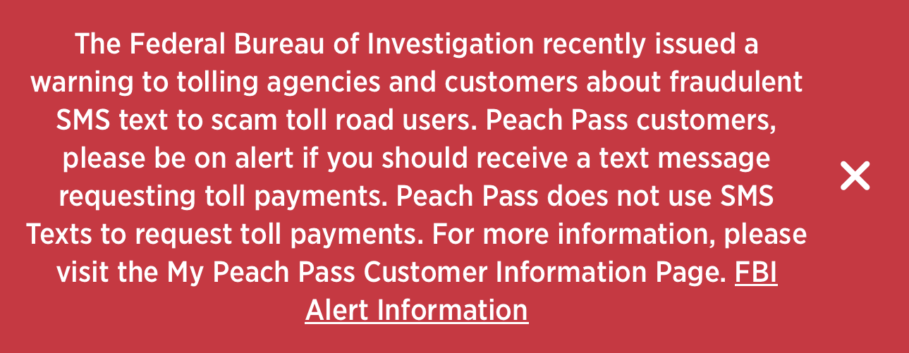 Peach Pass, the electronic toll system managed by the State Road and Tollway Authority, has issued many statements telling people that they will never send text messages about toll violations — and urging people not to click on any links in such messages.