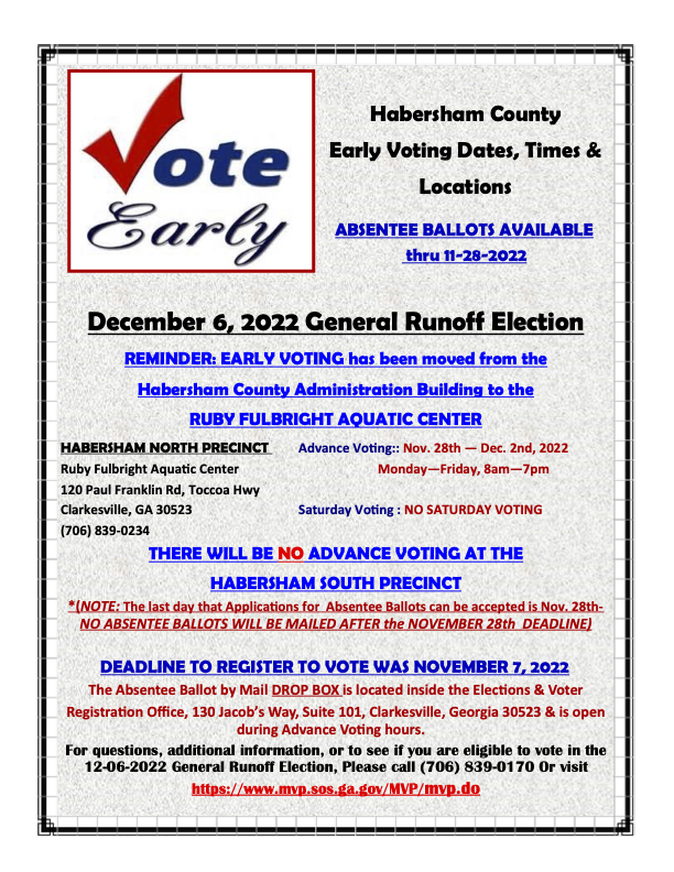 Habersham County Election Supervisor Laurel Ellison on Tuesday released the county’s early voting schedule. Only one precinct will be open for early voting – Habersham North at the Ruby Fulbright Aquatic Center in Clarkesville. Polls will be open from 8 a.m. to 7 p.m. November 28 through December 2.