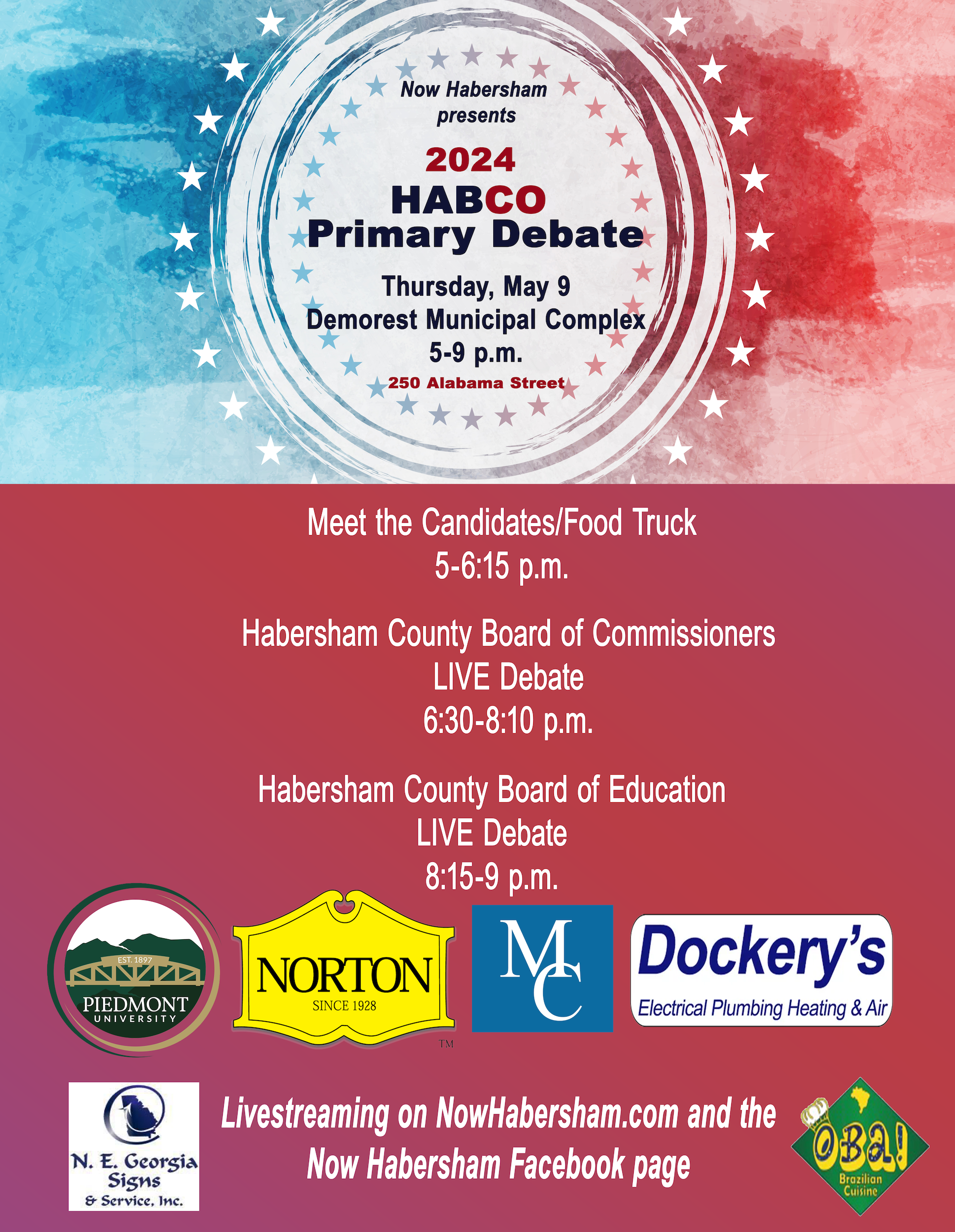 The 2024 HABCO Primary Debate is sponsored by Piedmont University, Dockery’s Heating and Air, the Norton Agency, and McDonald and Cody law firm.