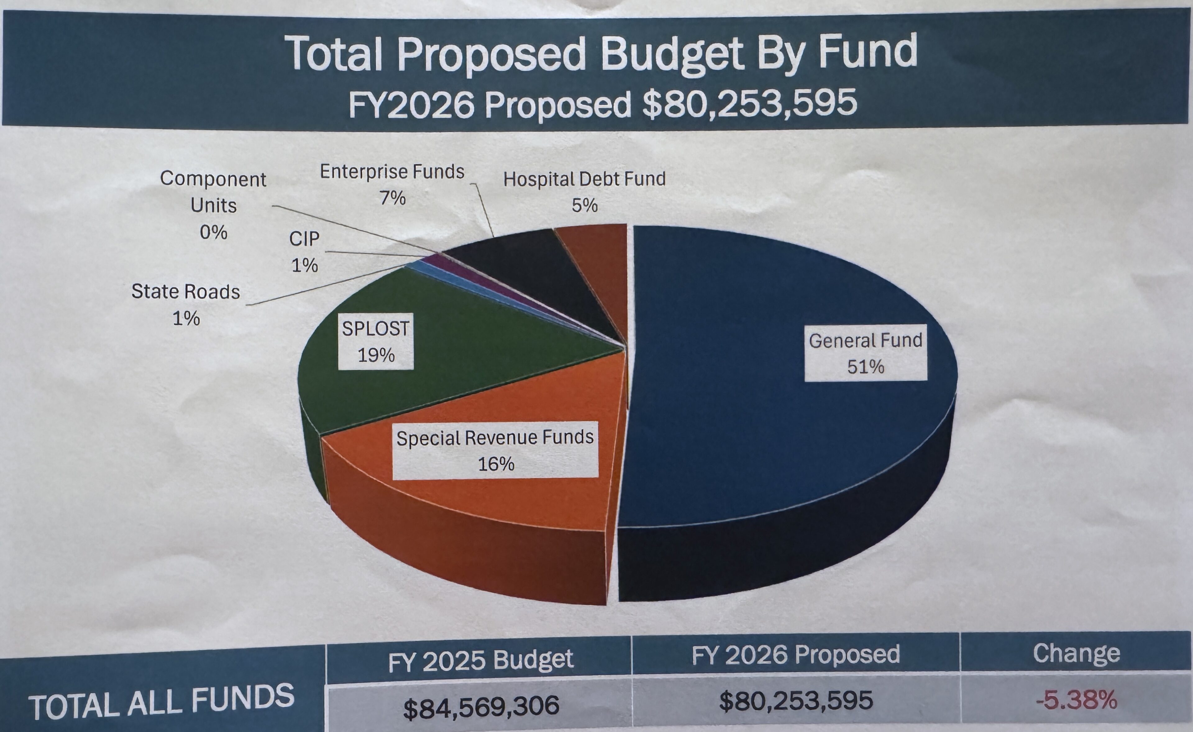 Commissioners Ty Akins, Kelly Woodall, Jimmy Tench, Dustin Mealor, and Bruce Harkness used the session to present budget goals focused on reducing overall spending and reprioritizing capital projects. The proposed total budget across all funds stands at $80.25 million, down 5.38% from the previous year.