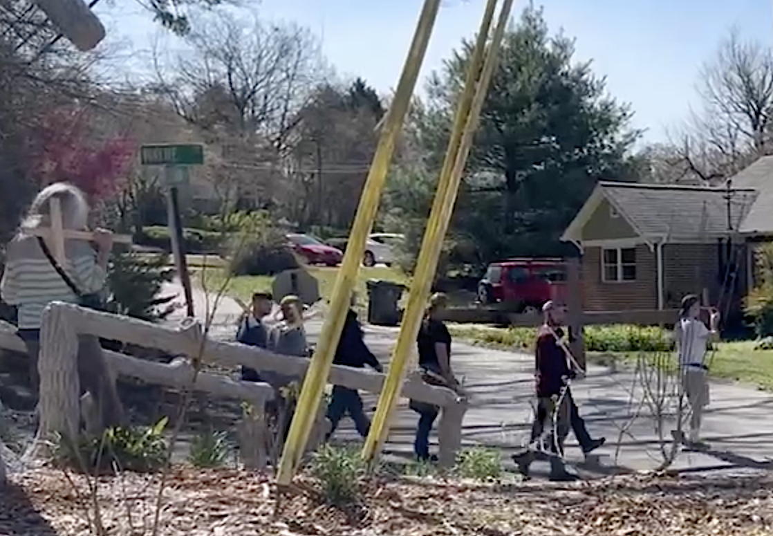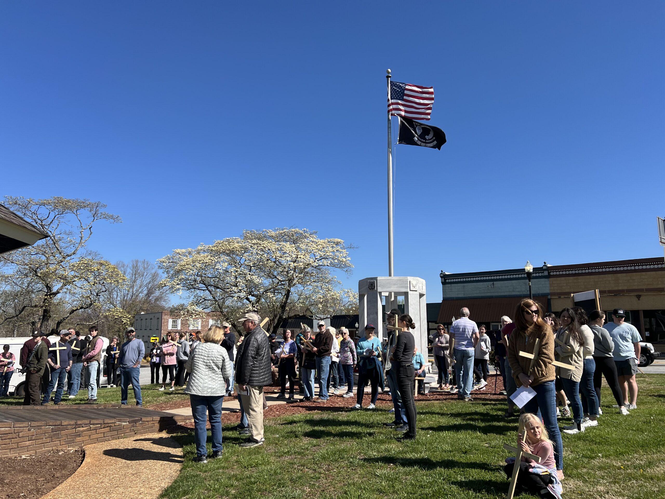 Clarkesville First Methodist Church held its annual Cross Walk on March 29. Participants walked a mile through town carrying small wooden crosses, stopping at different points to worship. Several men led the way, carrying a large wooden cross on their shoulders.