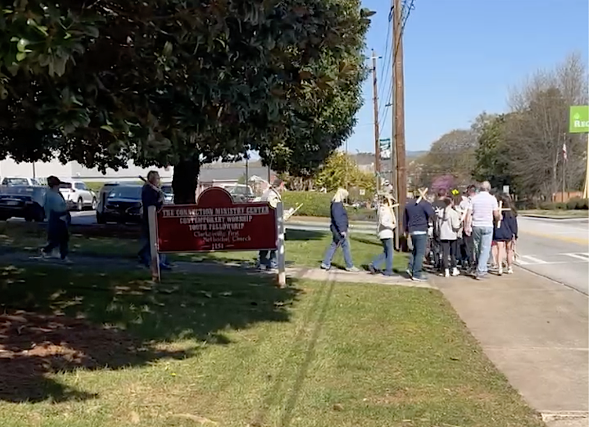 The event began at 10:30 a.m. from the church parking lot on Washington Street. About 75 walkers stopped at the gazebo in downtown Clarkesville for reflection and songs. They returned to the church by way of the Old Clarkesville Cemetery, where they stopped for another brief time of worship and prayer.