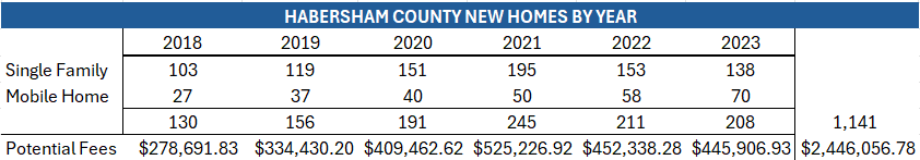 According to the Habersham Count Planning and Development Department, new single family homes are on the rise in Habersham County. Over the last six years, the county has had 1,141 new homes added. The table below shows the breakdown by type and by year. The table also shows the potential impact fees the county could have collected by using the average impact fee for those structures.