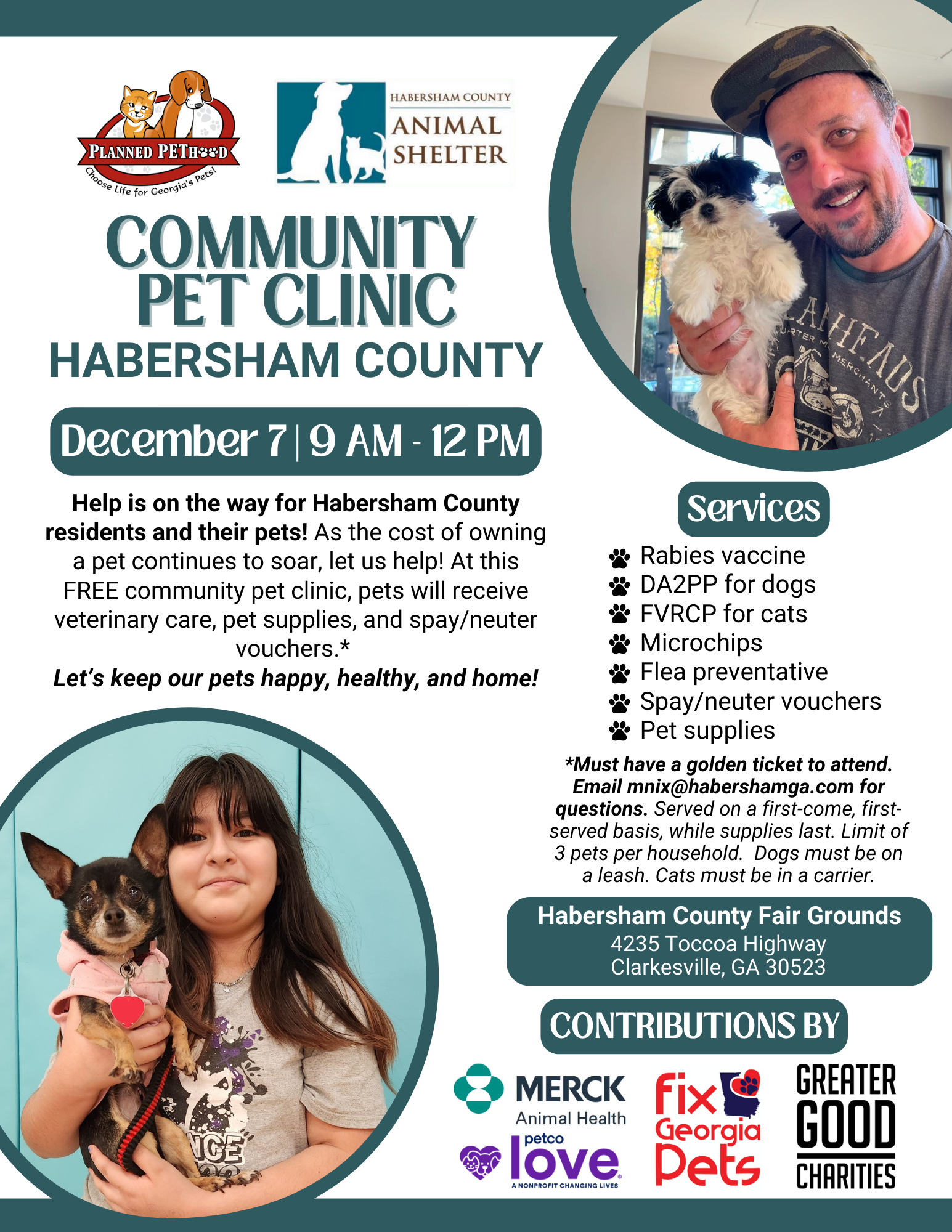 The Habersham County Animal Shelter is hosting a free drive-thru pet clinic at the Habersham County Fairgrounds on Saturday, December 7, from 9 a.m. to noon. The clinic will provide vaccines, microchips, flea treatment, and spay/neuter voucher applications.