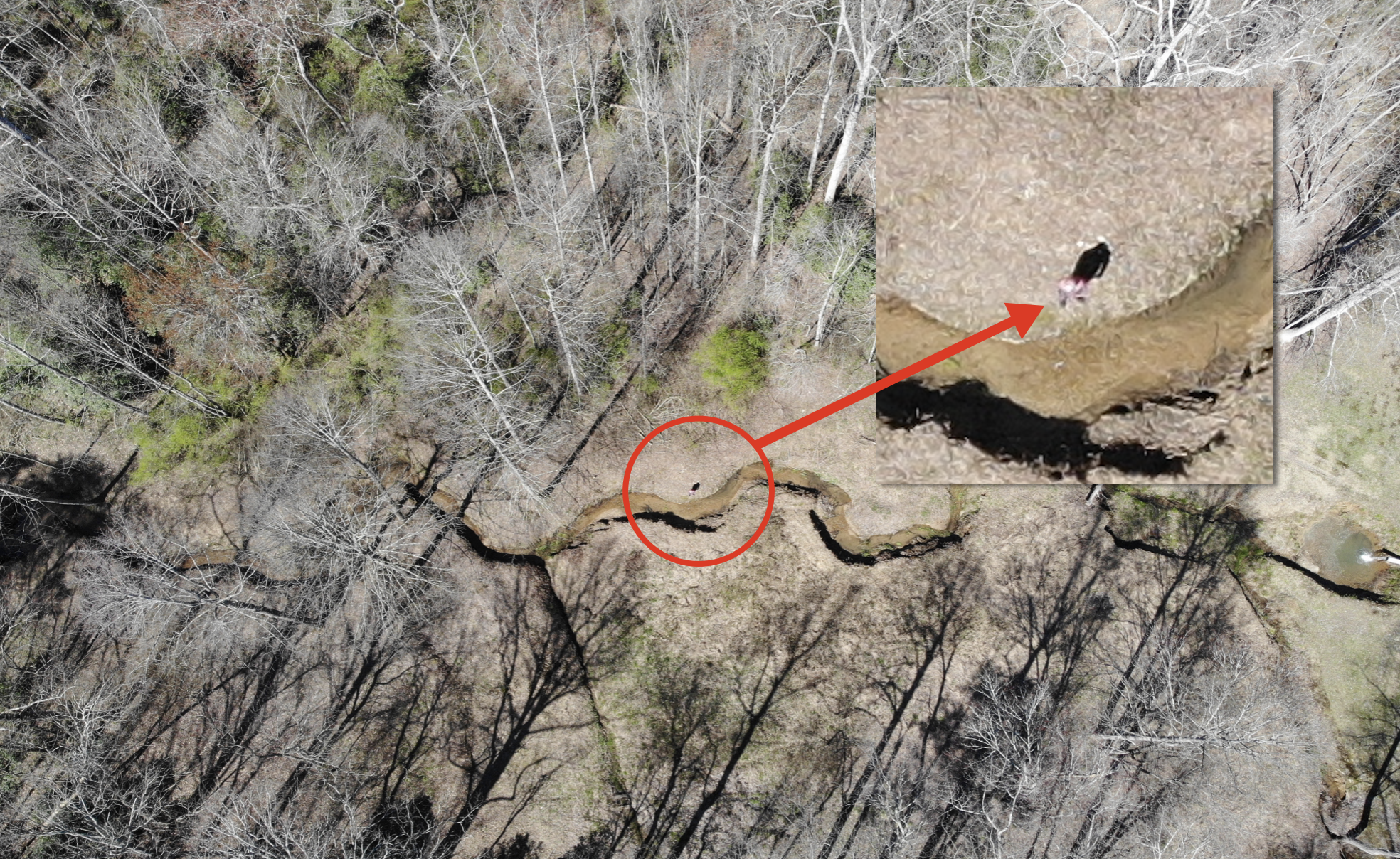 Habersham County Sheriff's Deputy Justin Williams captured this drone image of the missing boy standing by a creek near his home off North Mize Road. (Habersham County Sheriff's Office)