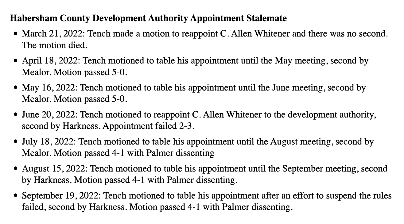 After several failed attempts to get Tench to sign off on another applicant and more back and forth with the county attorney, the commission course corrected. They withdrew the motion to suspend the rules and passed Tench’s motion to table the appointment for the fifth time. The motion passed 4-1, with Palmer dissenting.