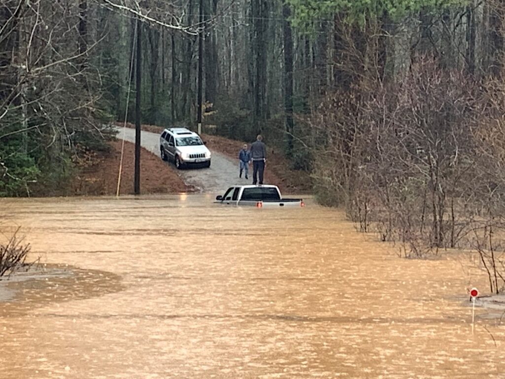 One of the trapped drivers was an Amazon deliveryman. His van was overtaken by floodwaters as he attempted to cross a bridge over Little Mud Creek on Garrison Drive in Cornelia.