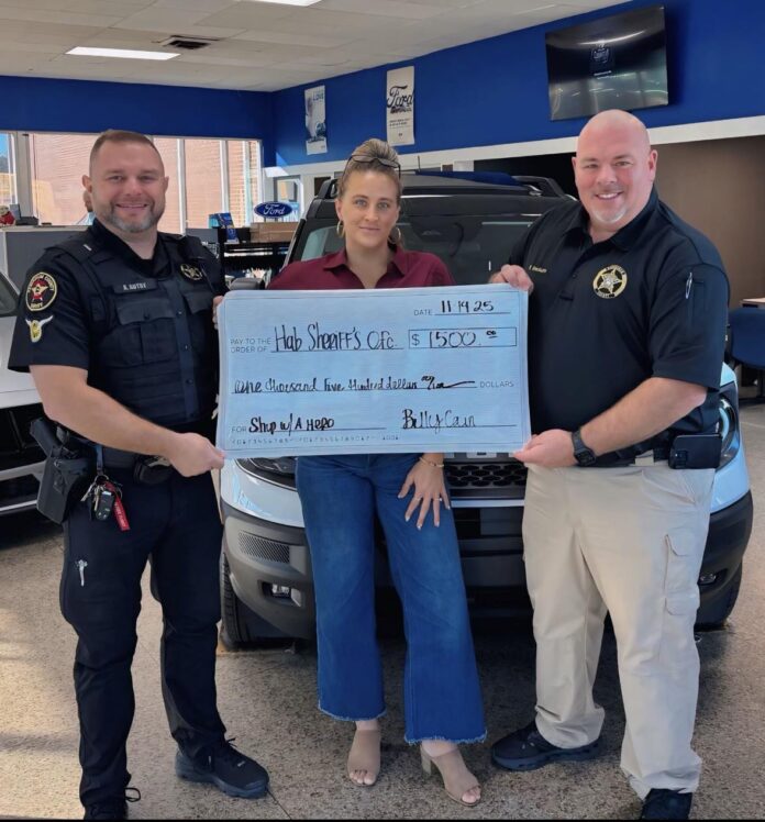 Habersham County Sheriff’s Office Lieutenant Aaron Autry (left) and Sheriff Robin Krockum accept a Shop with a Hero donation from Laci Carlson of Billy Cain Ford Lincoln in Cornelia. (HCSO Facebook)