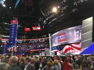 “It’s been great so far,” says Blackburn, who’s serving as an alternate with the Georgia delegation, “A lot of unity. The issues about protests and such, I haven’t seen one.” He dismisses national media reports of a delegate protest over convention rules. “That fizzled out after a few minutes. They put their face in front of the camera and then sat down or left.”