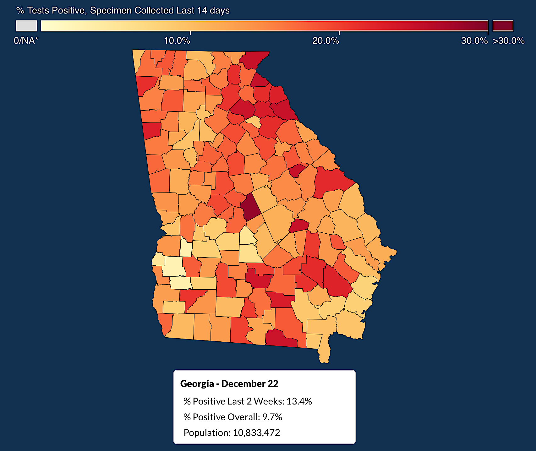 The two-week positivity rate in Stephens County is 25.2%, and in Rabun County, it’s 25%. Other area counties with high positivity rates at or above 20% include Hall, Hart, Elbert, Franklin, Jackson, Madison, and White.