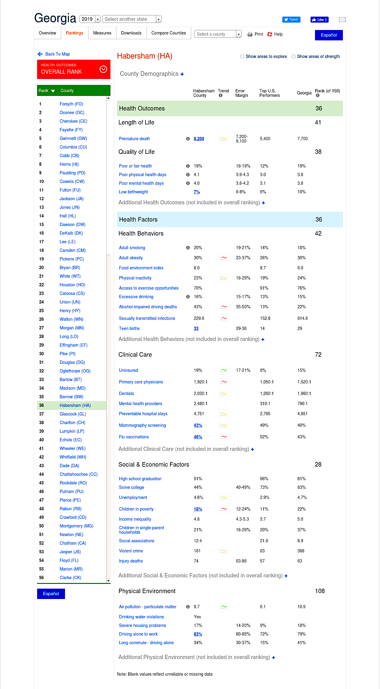 Habersham County ranks in the top 50 healthiest counties in Georgia and the top 5 healthiest in northeast Georgia. The annual County Health Rankings report ranks Habersham 36th out of the state’s 159 counties.
