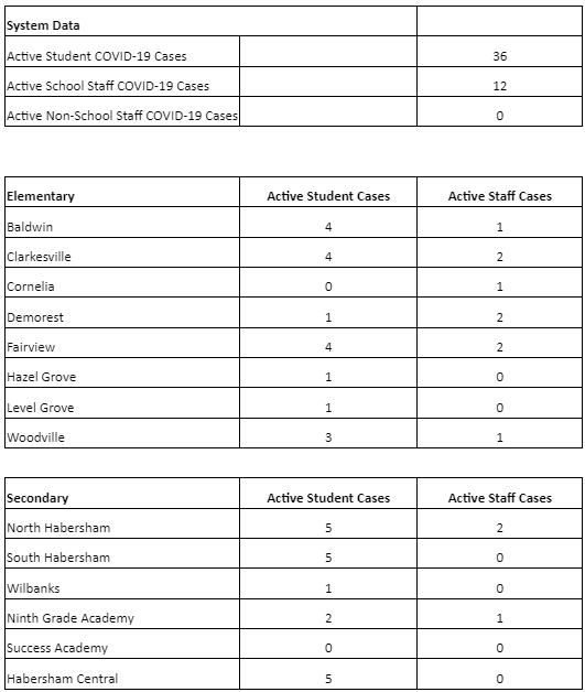 The number of cases in the Habersham County School System have decreased from last week’s, from 58 student COVID-19 cases to 36, and from 32 school staff cases to 12. There are currently 61 students in quarantine due to possible exposure, which is up five students from last week.