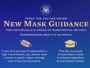 As the COVID-19 Delta variant spreads rapidly through the state, with COVID-19 hospitalizations up 170 percent from last month, the CDC’s recommendations sharply contrast their mask-free announcement from just months ago. The CDC still maintains that those who have been fully vaccinated against COVID-19 can participate in most activities they did before the pandemic, but recommends that people wear masks while indoors in public to protect against the Delta variant.
