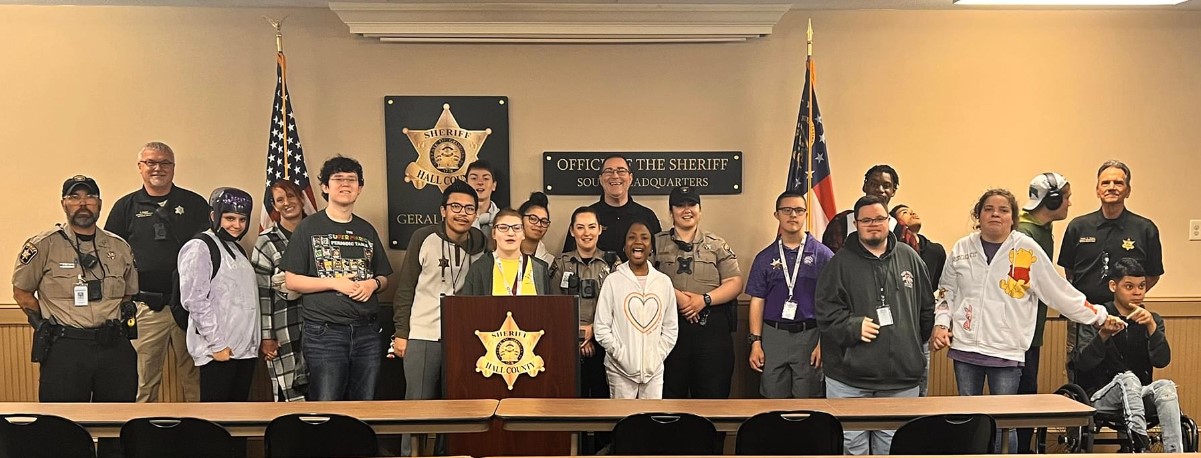 Ashton Lyons and his classmates in the Cherokee Bluff High School special needs classes recently visited the South Hall Precinct. They were interested in seeing where their favorite SROs work when the officers are not at school.