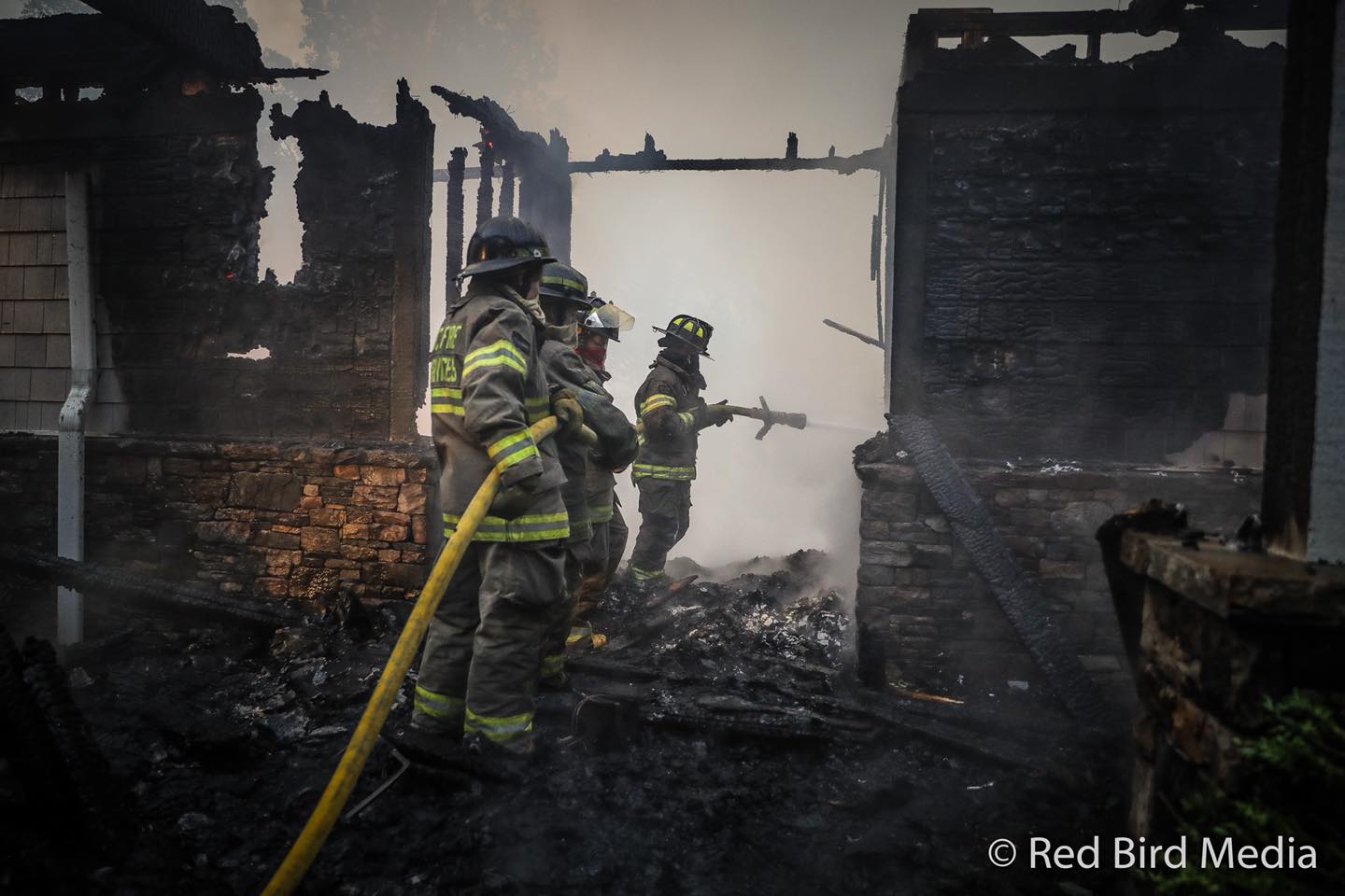 Unable to save the home, crews took a defensive attack. They shuttled in water from a nearby hydrant with tanker trucks and used a fireboat to fight the flames from the lake side.