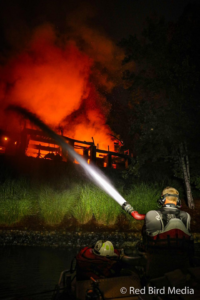 When units arrived on the scene, the 4000-square-foot lake house was fully involved. Due to the fire’s location and the fact half their crew was working another structure fire on the other side of the county, Rabun County Fire Services requested mutual aid from Habersham County Emergency Services. Lee Arrendale firefighters also responded.