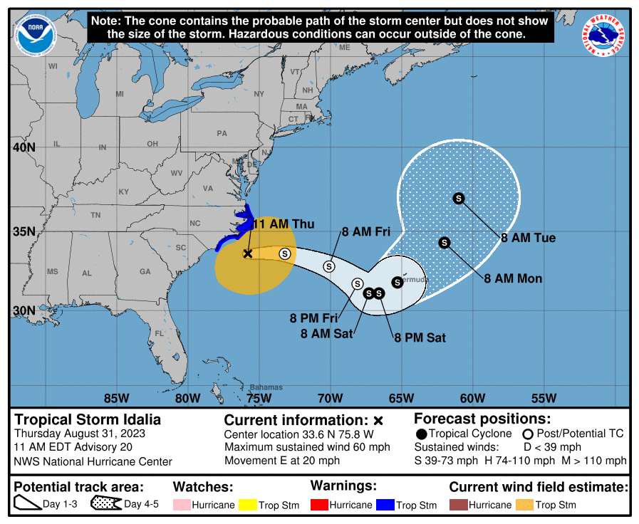 Tropical Storm Idalia has moved off the coast of North Carolina. The storm battered the southeastern U.S. coastline Wednesday after slamming into Florida earlier in the day as a major hurricane.