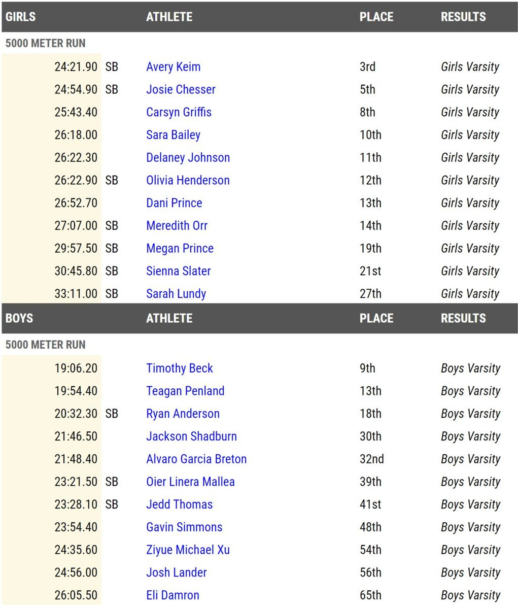 Avery Keim and Josie Chesser both put up season-bests to guide the Lady Indians. Keim was third and Chesser 5th, while Carsyn Griffis placed eighth and Sara Bailey 10th. Timothy Beck was ninth to lead the boys.