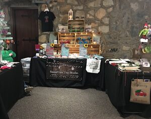 Staying close to home wasn’t an issue for Becky and Billy Bending, They own the Country Cobbler in Cornelia, less than a mile away from the Community House. He’s been repairing shoes there for over 35 years. “Folks don’t realize that you can still fix shoes,” Billy laments. The couple branched out this year and started making handmade leather goods to expand their business. That’s what drove them to sign up as first time sellers at the Holiday Market.