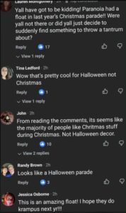 Screenshots of public posts showed grandparents, parents, and parade-goers describing confusion when the float appeared, an unorthodox follow-up to the earlier presented Nativity and classic Christmas films. Residents said the sequence created an abrupt change in tone and made it difficult for some families to reassure children who looked for beloved symbols of the season, like Snoopy, Santa, or even the Nightmare Before Christmas (which was well received by the audience).