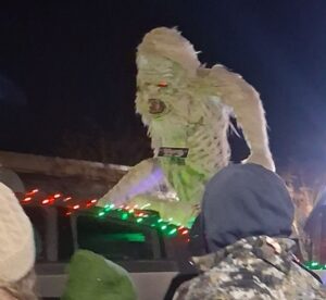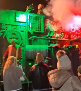 The procession shifted when a float from Paranoia Haunted House moved down the route. The float carried large demons with contorted limbs and flames that rose above the platform. Families later reported that children reacted with fear when the fire, skeleton figures, and anthropomorphic demons came into view. One grandmother wrote on Facebook, “Yeah, scared the grandchildren to death,” and other public posts described similar scenes as the float passed.