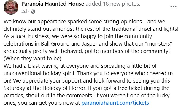 After the parade, Paranoia Haunted House, located in Canton, posted a message that acknowledged the range of reactions to its appearance and noted that its float stood apart from the traditional themes in the lineup. The business described its participation in the Ball Ground and Jasper parades as part of its effort to join local holiday events. The post thanked those who supported the float.