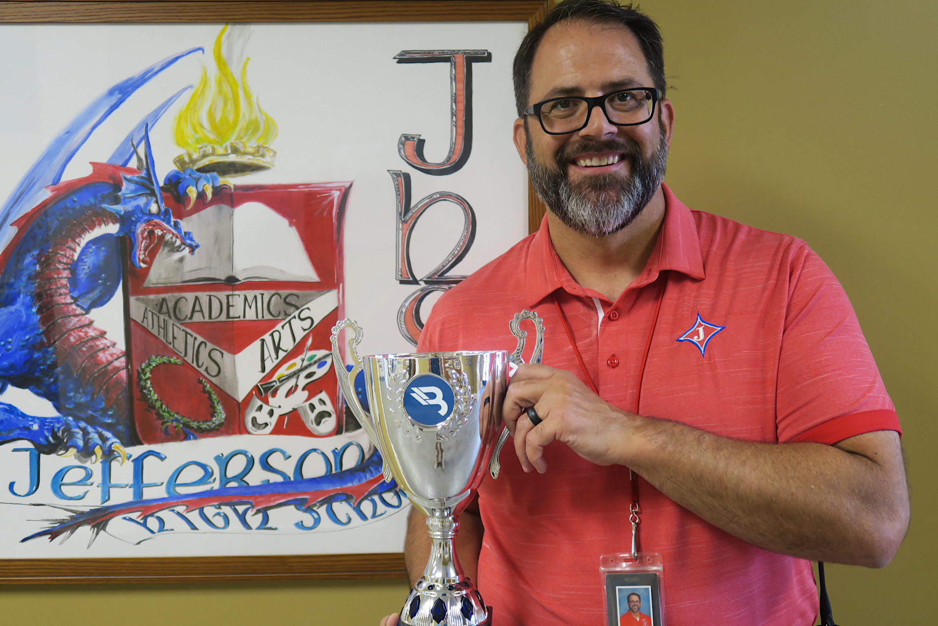 On Wednesday morning, Jefferson Athletic Director Bill Navas accepted the BLITZ Cup Trophy to be housed at the school for the upcoming school year. The Dragons and Lady Dragons’ athletic programs combined to win the 2018-19 BLITZ Cup, which had previously been held at Banks County.