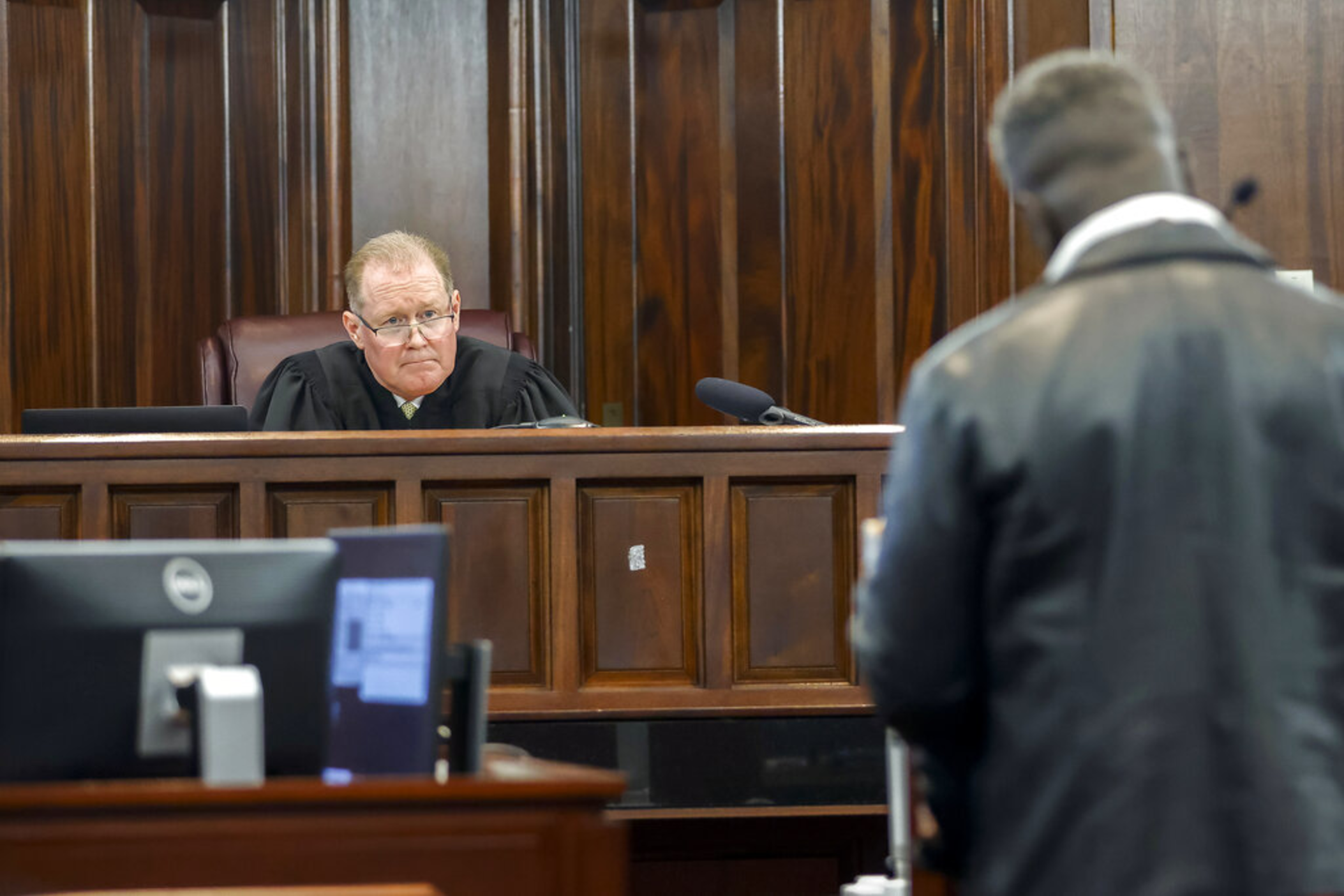 Superior Court Judge Timothy Walmsley, left, listens to Ahmaud Arbery's father Marcus Arbery's impact statement during the sentencing of Greg McMichael and his son, Travis McMichael, and a neighbor, William "Roddie" Bryan in the Glynn County Courthouse, Friday, Jan. 7, 2022, in Brunswick, Ga. The three were found guilty in the February 2020 slaying of 25-year-old Ahmaud Arbery. (AP Photo/Stephen B. Morton, Pool)